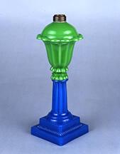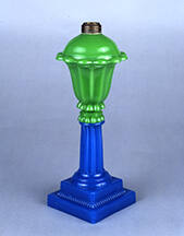 DescriptionOpaque yellow-green glass font, translucent medium blue alabaster wafe, shaft, and base. Font pressed upright in a female mold of three vertical sections, in the same manner as 1969.155. Joined by a wafer to the fluted columnar shaft and square base, also pressed in the same manner as 1969.155. Joined by a wafer to the fluted columnar shaft and square base, also pressed in the same manner as 1969.155. No pontil mark.