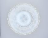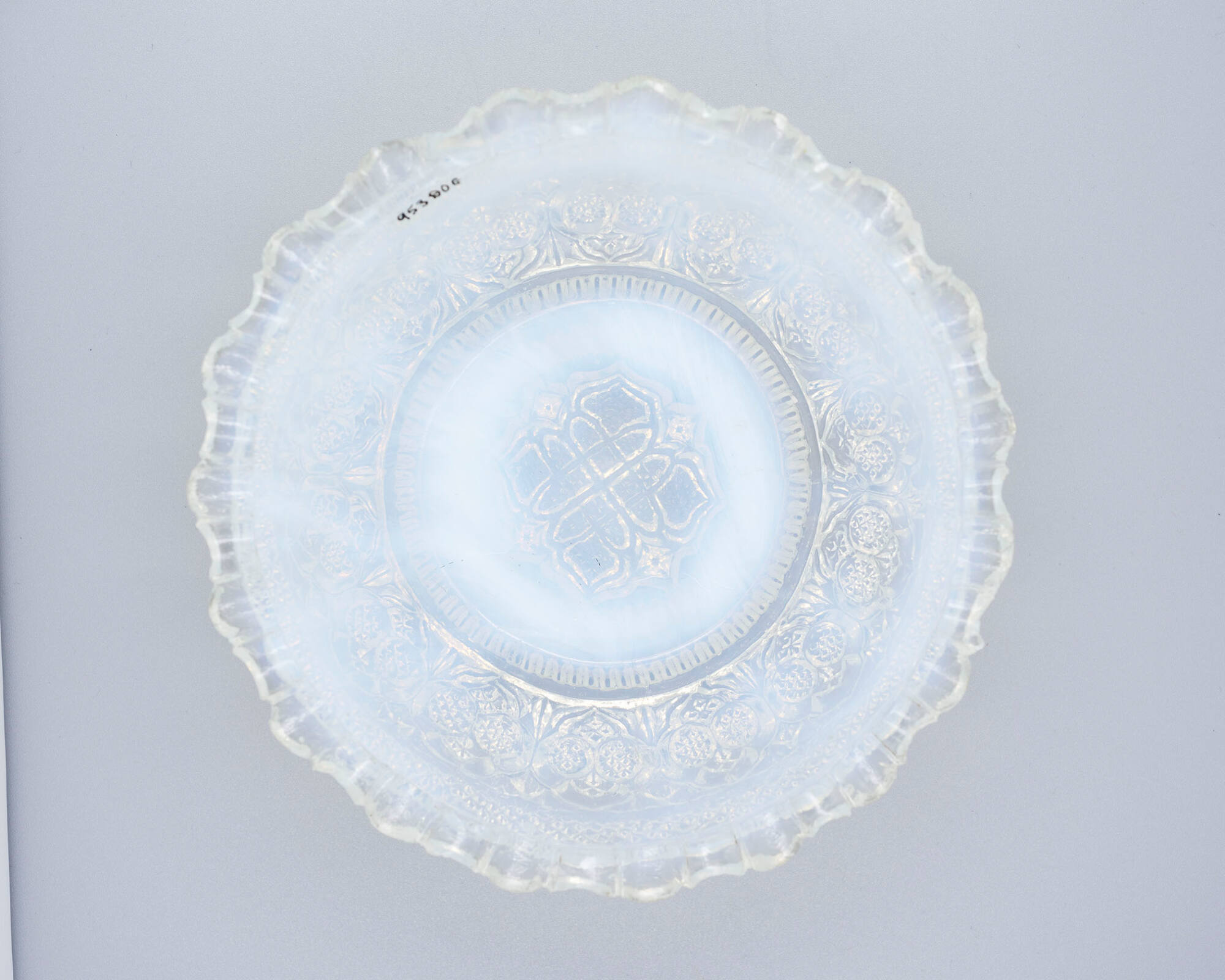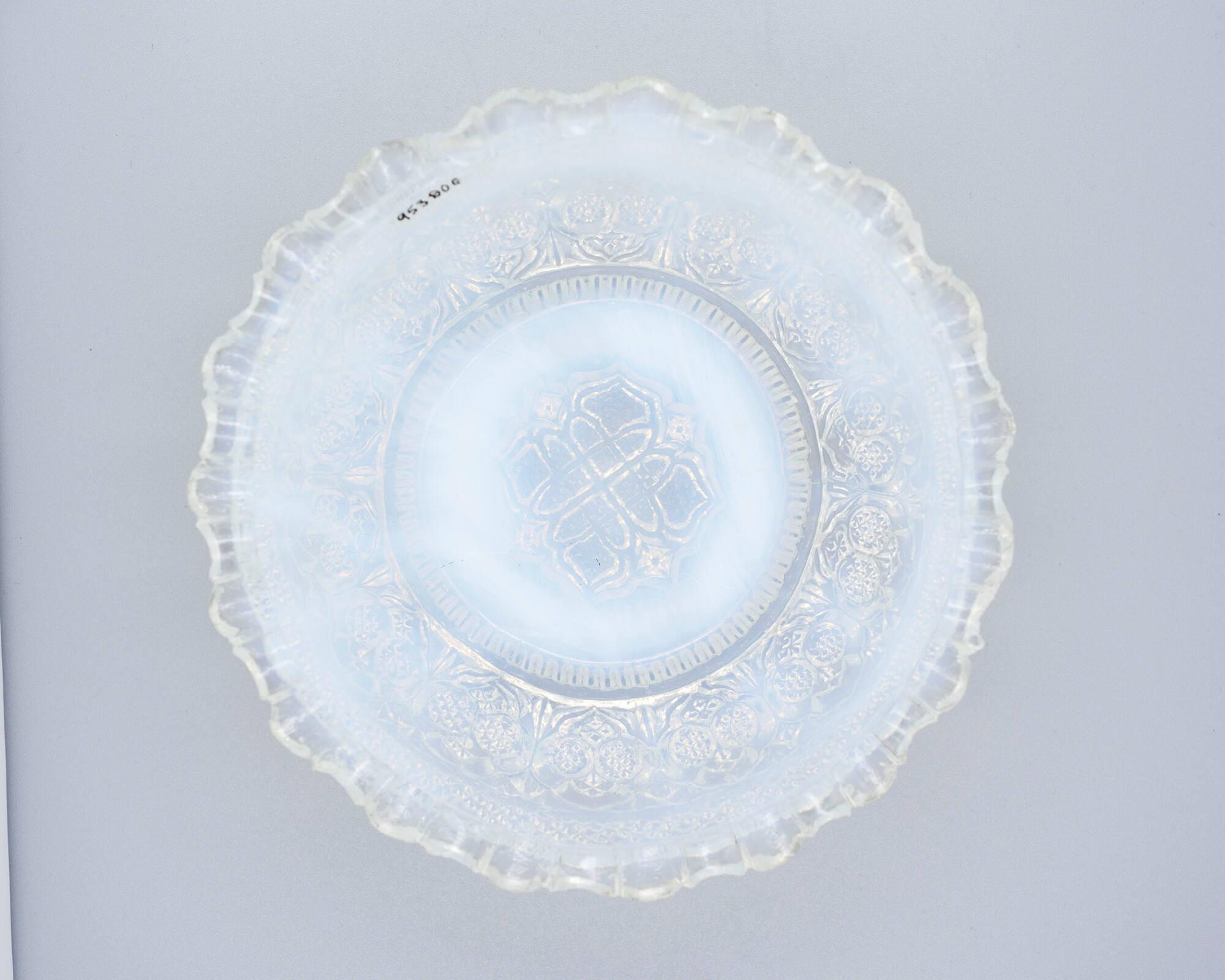 DescriptionThick, heavy opalescent glass. Pressed, probably upright, in a female mold of three vertical sections bearing the pattern for the side of the bowl and the underside of the rim and a base plate that formed the edge of the foot and bore the pattern for the underside of the base—a circle of triangular serrations surrounding the "endless knot" motif—by a male plunger, plain except for the undulating pattern on the upper side of the rim.