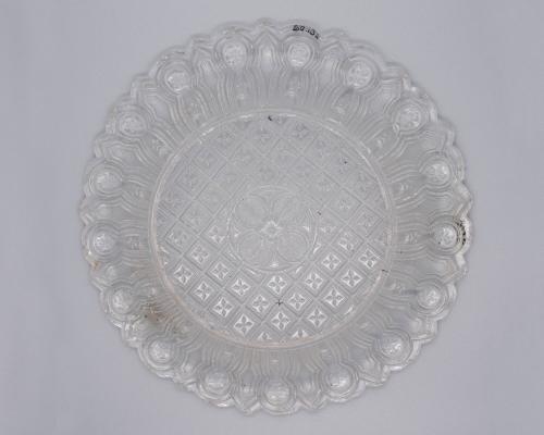 DescriptionPressed upside down over a plain male mold by a female plunger bearing the pattern. Plain, slightly rounded foot ring. Shear mark on patterned underside of base.