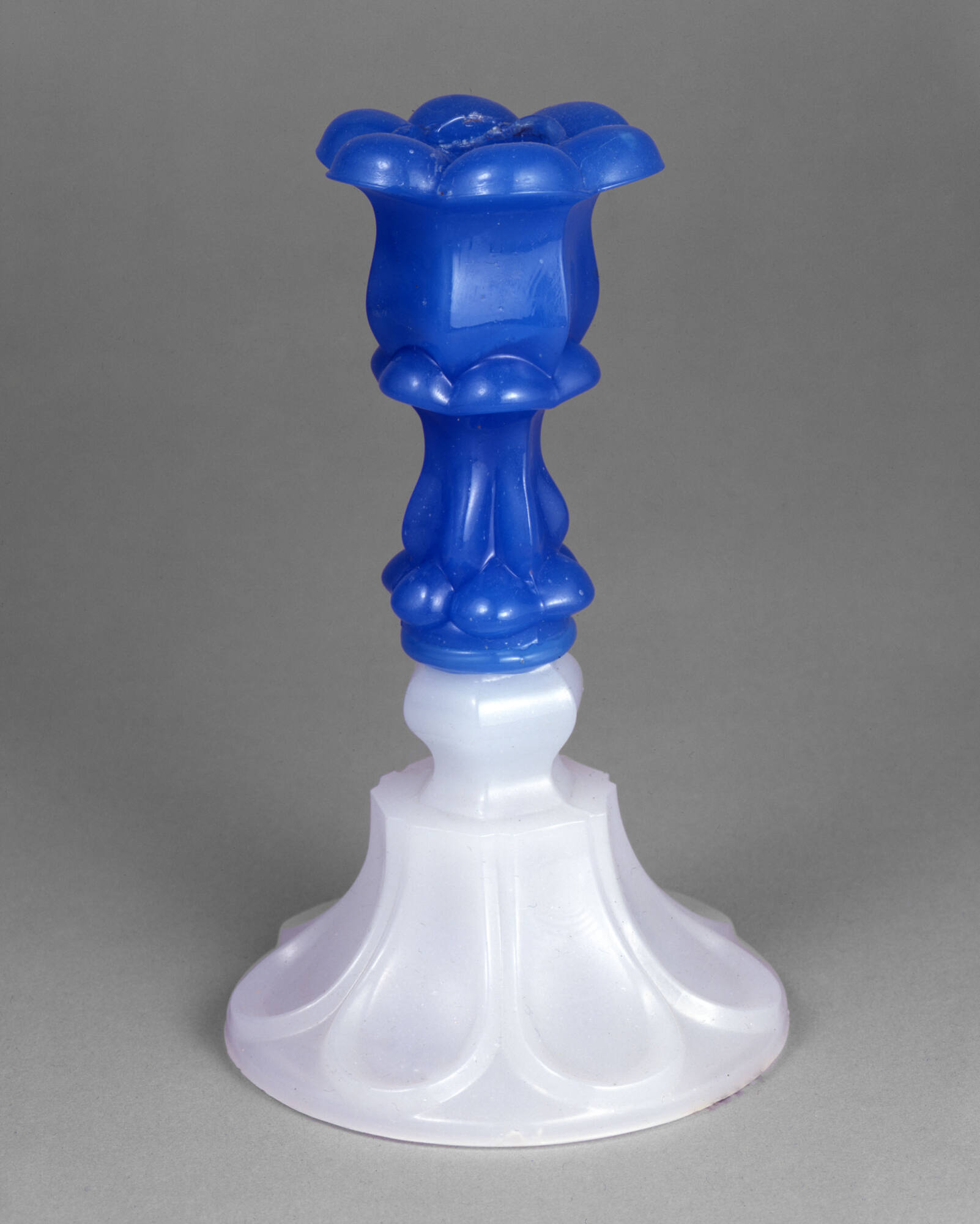 DescriptionSocket and stem pressed in a female mold of three vertical sections by a plain male plunger that formed the interior of the socket, with a cap ring that formed the top seven petals. Joined by a wafer of blue glass to a stem and base pressed in the same mold as that used for 1969.101.