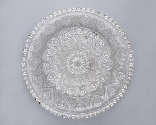 DescriptionPressed upside down over a plain male mold by a female plunger bearing the pattern, including the fifteen bosses in the centers of the scrolls that form, in effect, the foot ring.