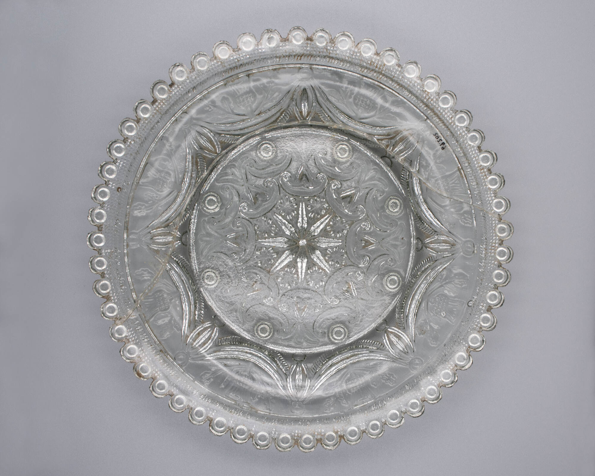 DescriptionPressed upside down over a plain male mold that formed the upper surface by a female plunger bearing the pattern that formed the entire underside of the plate, including the bull's-eyes. Stippling on the base is very faint, like the impressions of a cloth pressed into damp clay. The piece rests on eight bull's-eyes around the edge of the base.