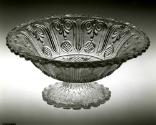 DescriptionPoor-quality glass with a pinkish tinge; bowl probably pressed upright in a one-piece female mold bearing the pattern by a plain male plunger that formed the interior, with a cap ring that formed the scalloped edge of the rim and the narrow plain band below it. Base probably pressed upside down in a one-piece female mold bearing the pattern, by a plain male plunger and with a cap ring that formed the scalloped edge.