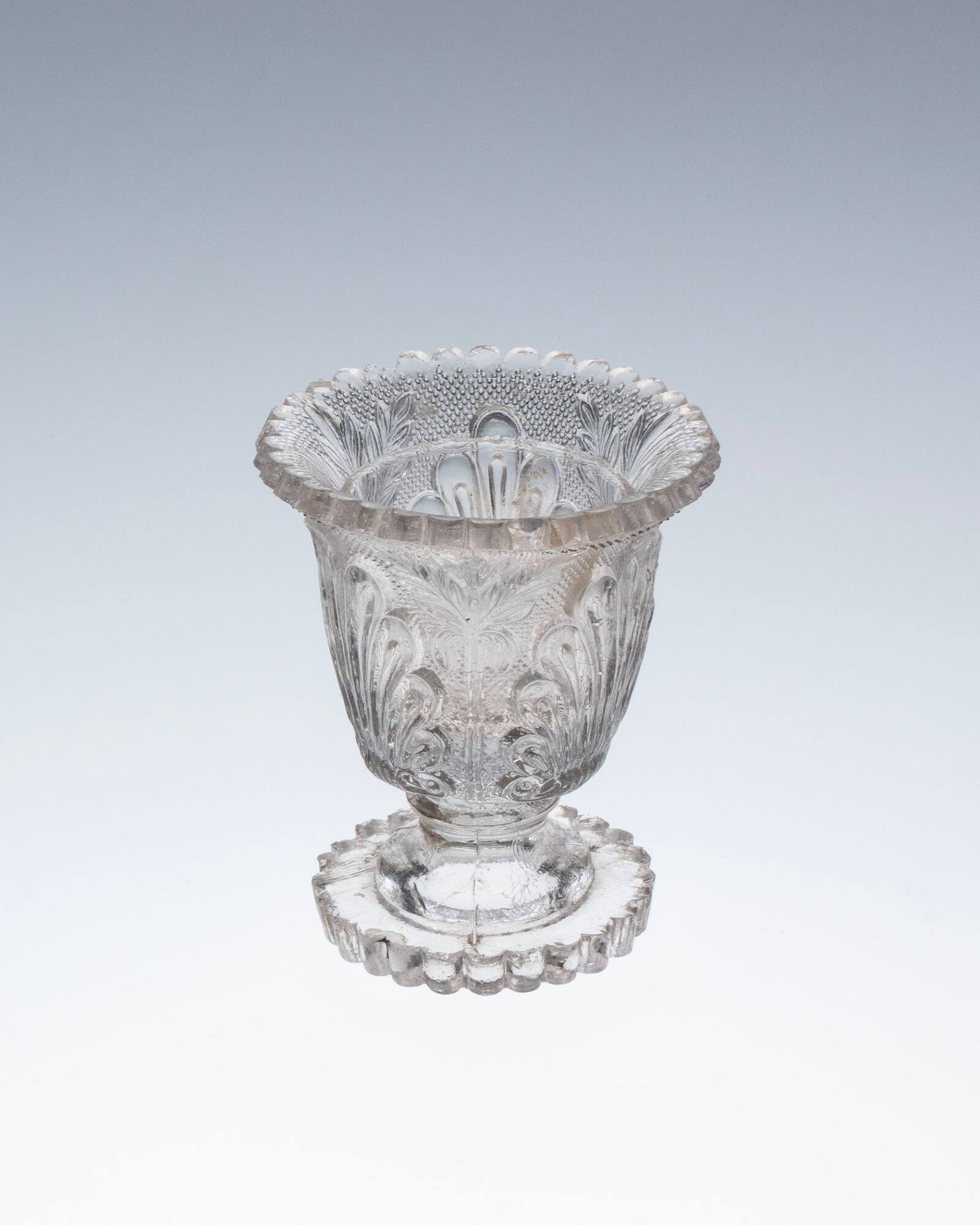 DescriptionColorless with a grayish tinge. Stem and bowl pressed in a female mold of three vertical sections bearing the pattern by a plain male plunger. Scalloped foot and hollow stem pressed in a combination of female and male molds. Hollow bowl formed either by being pressed by a plain male plunger or by being blown by the Robinet forced-air process.