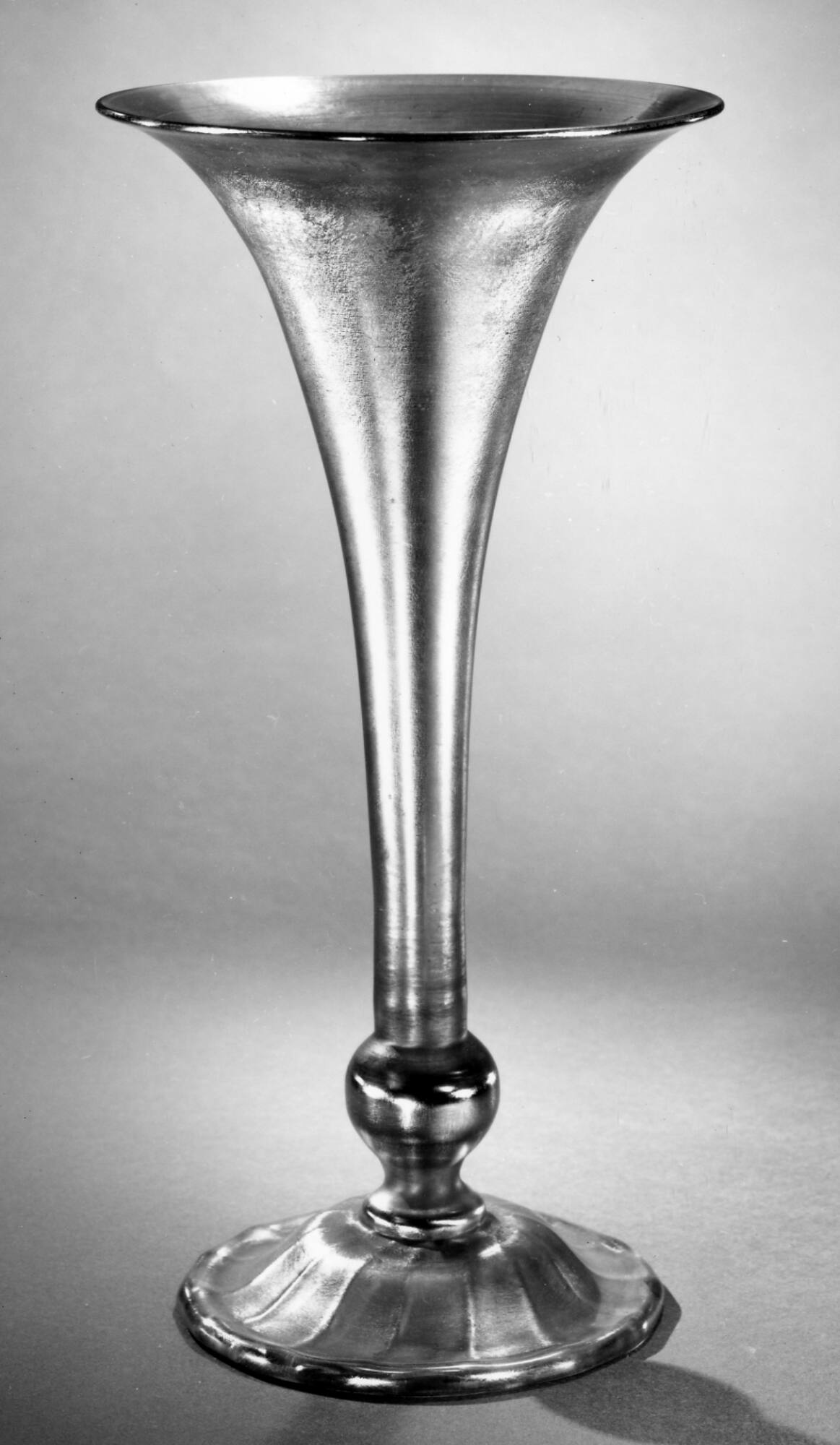 DescriptionBlown and finished by tooling. Applied foot blown in a mold and patterned with fourteen vertical ribs, then finished by tooling; rim folded under. Greenish-reddish gold iridescent finish. Rough pontil mark.