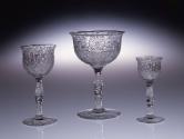 DescriptionBowl blown, possibly in a paste mold for shape. Applied stem and foot. All finished by tooling. Bowl copper-wheel-engraved in the rock-crystal style with three stylized orchids alternating with three Prince-of-Wales feathers, or an elaborate fleur-de-lis, with an area left blank for an initial or monogram. Stem and underside of foot engraved with orchids and foliage.