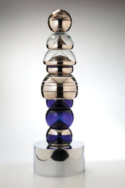 Label TextWhen Joel Philip Myers introduced his “Dr. Zarkov” series in 1970, he had already set up a glass program at Illinois State University. The works in that series gain their height simply by stacking similar, thinly-blown forms into tall, totemic sculptures with mirrored and colored zones seemingly defying gravity. Their perfection set them apart from most other Studio Glass that relied instead on organic forms. Their repetition and uniformity, employed to great effect by minimalist sculptors such as Donald Judd, suggested industrial production as a concept—a creative statement yet untried in Studio Glass at the time.Published ReferencesPage, Jutta-Annette, Peter Morrin, and Robert Bell, Color Ignited: Glass 1962-2012, Toledo, OH, 2012, p. 40, repr. (col.) p. 45, pl. 20.Exhibition HistoryToledo Museum of Art, Color Ignited: Glass 1962-2012, June 14-September 9, 2012.1st century BCE - 1th century CE