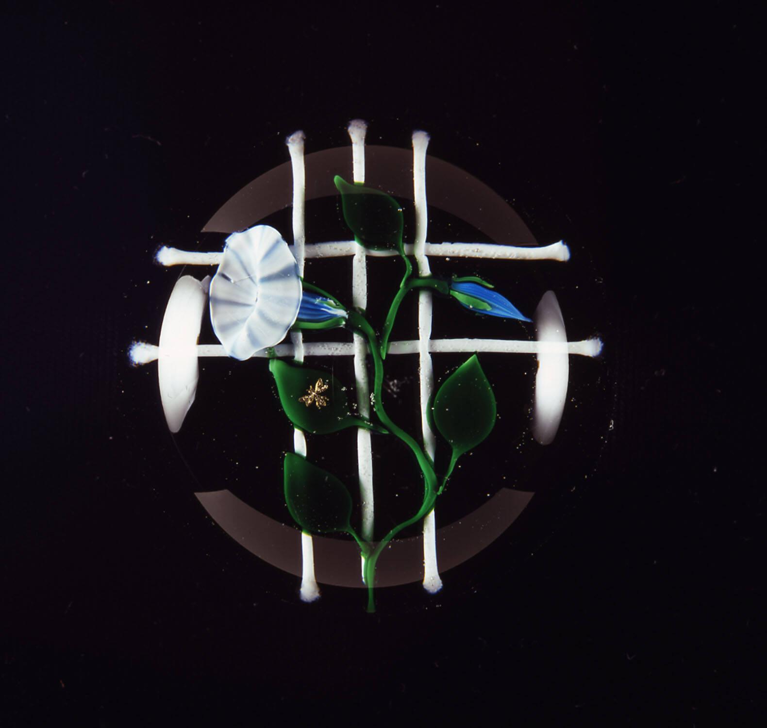 Colorless dome enclosing blue and white morning glory (one blossom, one bud); green leaves and stem growing up white trellis; gold bug on one leaf; amethyst colored ground.