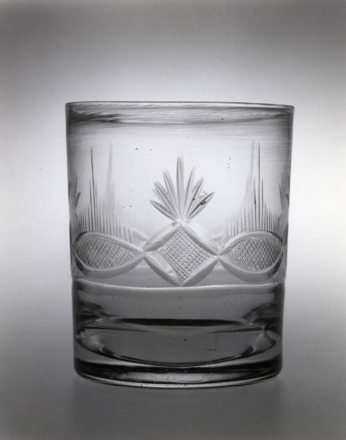 DescriptionBlown in a cylindrical mold to form the base and establish the initial shape, then expanded and finished by tooling. The entire base was ground and polished. Cut rather crudely with strawberry-diamond, fan, vesica, and blaze motifs.