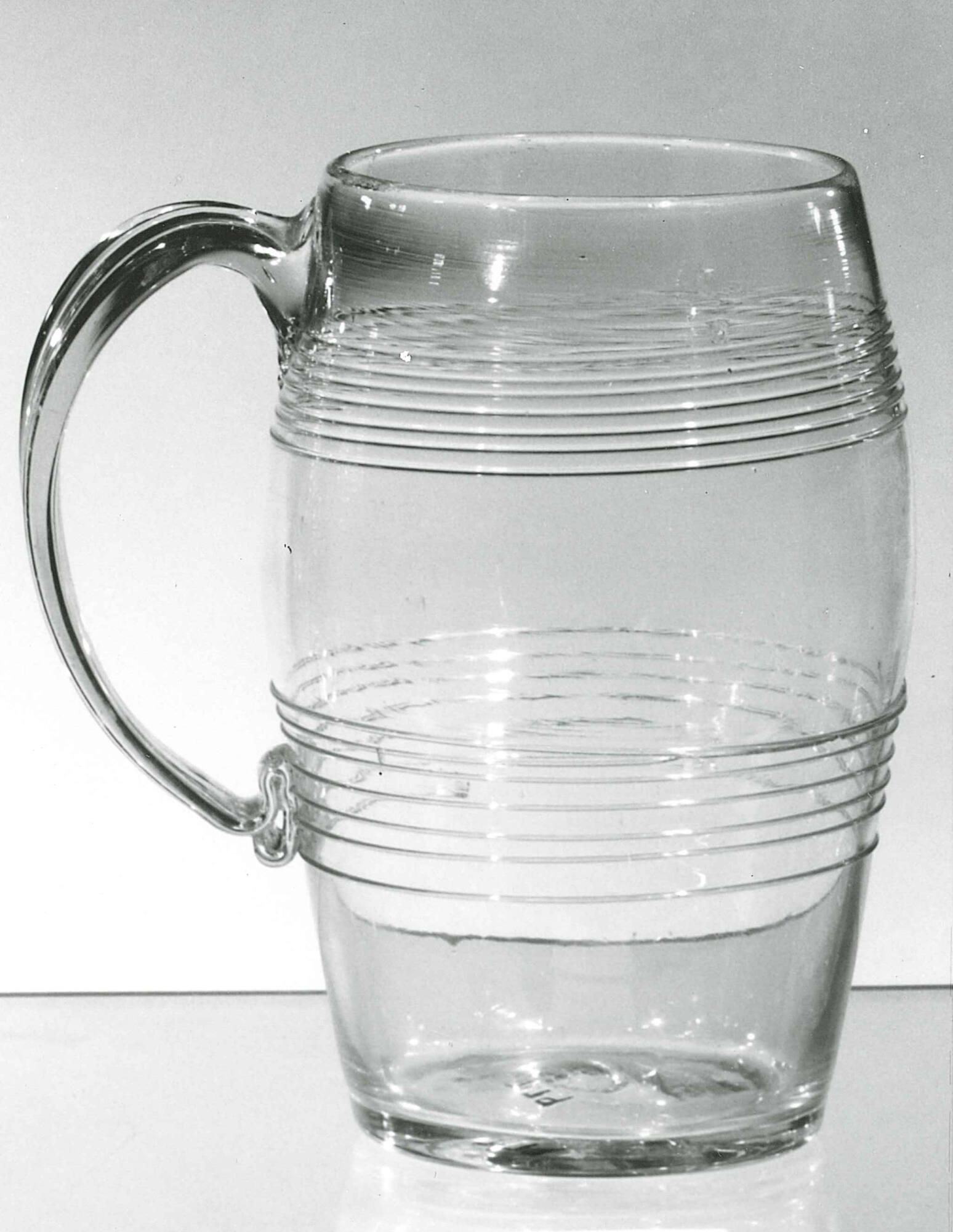 MediumColorless non-lead glass; blown and finished by tooling. Two spiral threads wound around the top and middle of the body. Plain strap handle applied. Rough, solid pontil mark.