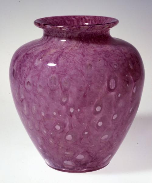 DescriptionSteuben no. 2683 vase, Cluthra. Gather rolled over crushed light amethyst glass bits of varying sizes and sodium or potassium nitrate, which caused the crushed glass to foam and produce bubbles of varying sizes as it was overlaid with another gather of colorless glass. Blown in a paste mold and finished by tooling. Concave, polished pontil mark.