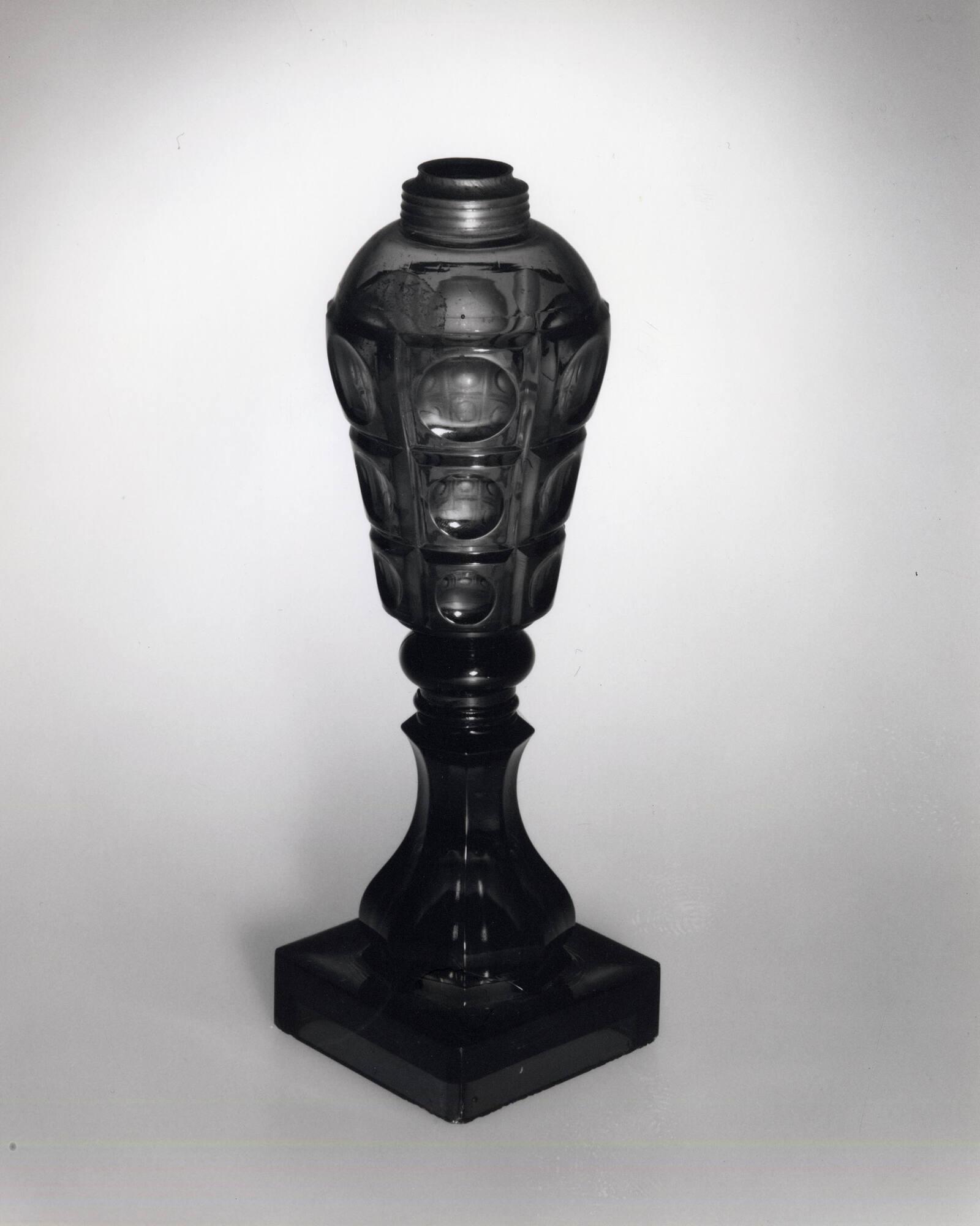 DescriptionFont and stem, including cushion knop and short cylinder below it, pressed upright in a female mold of three vertical sections bearing six rows of block-and-printie patterns, in conjunction with a one-piece cylindrical mold from which the domed top was formed by reheating and tooling, by the Magoun patent method, by a plain male plunger. Joined by a wafer to a hexagonal standard on a square plinth with narrow chamfered corners. Standard and plinth pressed upside down in a female mold of two vertical sections, the mold opening diagonally at opposite corners at the right edge of the chamfer, by a plain male plunger that formed the hollow circular and square interior of the standard and base and also the flat underside of the base and short beveled edges that join the sides of the base. No pontil mark. Pewter collar machined and threaded.