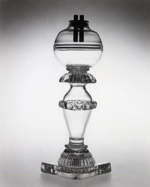 DescriptionFont blown and finished by tooling, with a mercurial ring formed by an air trap. Joined by an applied pressed ribbed mushroom-form collar to the blown and tooled inverted baluster standard. Applied band of raspberry prunts on standard. Joined by a wafer to a domed base on a square plinth with a lemon-squeezer design on the underside. Base pressed by a hand press. Fitted with a double-wick cork-supported tin burner for whale oil.