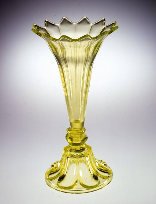 DescriptionBowl pressed upright, probably in a one-piece mold that formed the 12 panels, by a plain conical male plunger that formed the interior and probably the pointed top edges of the panels. Joined by a wafer to a hexagonal stem and a round base with seven loop panels. Stem and base pressed upside down in a female mold of two vertical sections bearing the pattern by a plain male plunger that formed the hollow interior of the base and slightly rounded foot. Upper section of vase and rim reheated and flared outward by tooling. Rough, solid pontil mark at the top of hollow base.