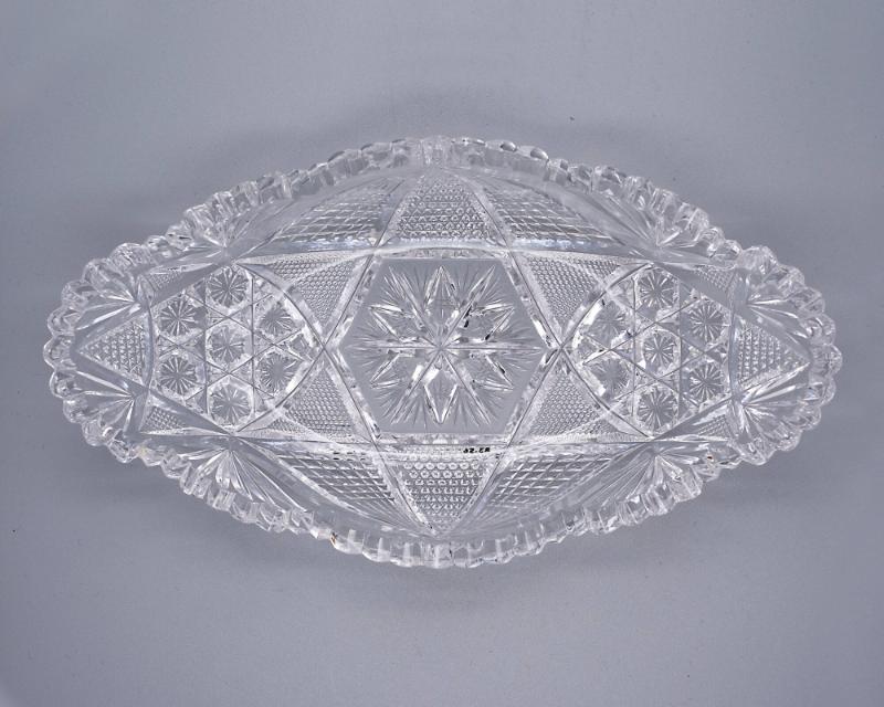 DescriptionLibbey no. 266 celery tray. Cut with a pattern of unknown name: variety of geometric motifs.