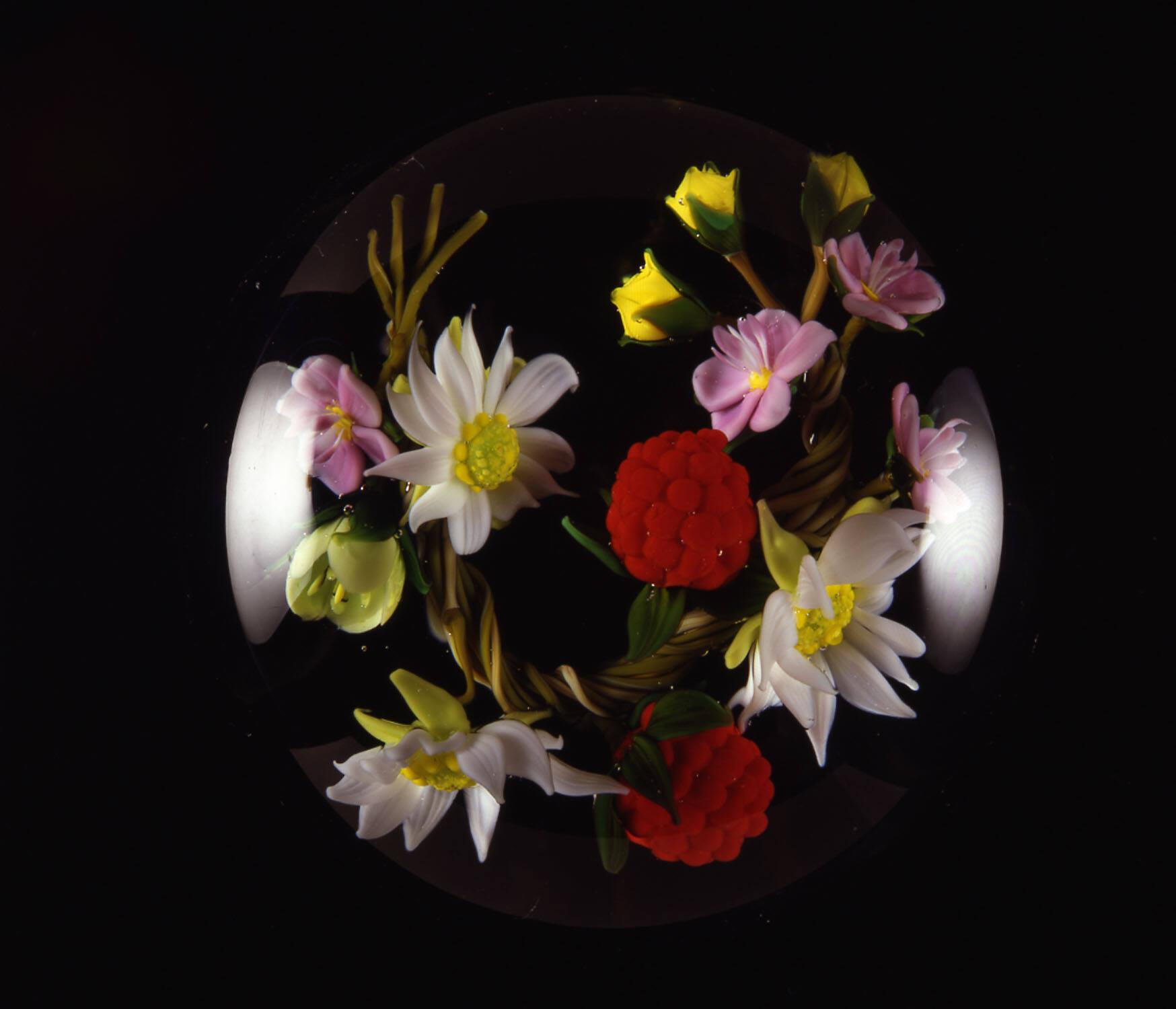 DescriptionPaperweight with raspberries, daisies, loosestrife buds, and pink mountain hawthorn, all with entwined stems.