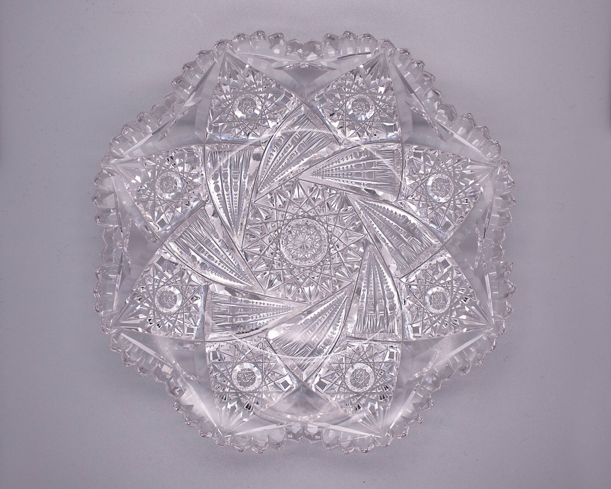 DescriptionCut with a pattern of unknown name: a central sixteen-pointed hob star circumscribed by an octagon, surrounded by eight cometlike sheaves with eight sixteen-pointed hob stars around the rim.