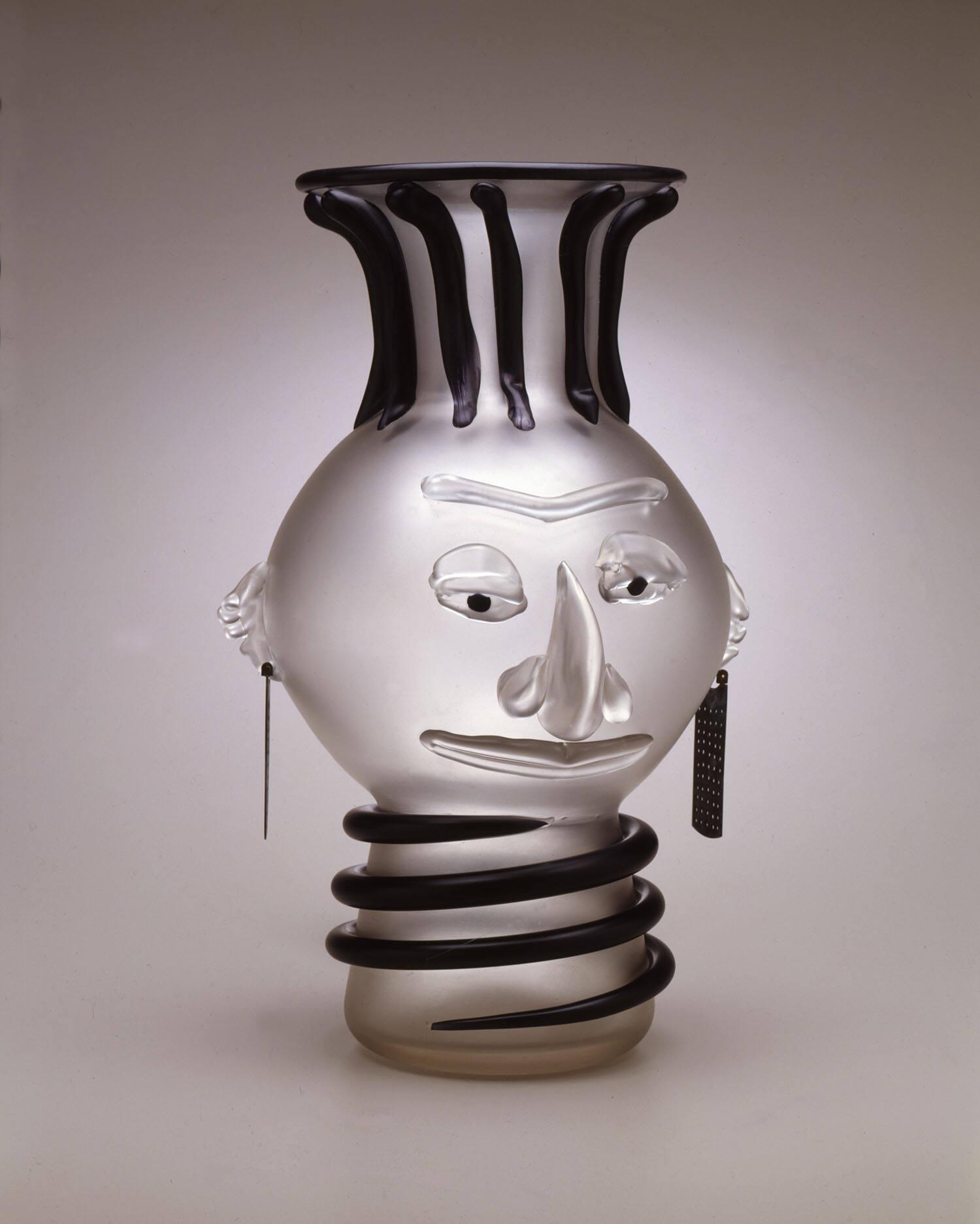 MediumColorless and black glass, blown, sand-blasted, and acid-polished; bronze