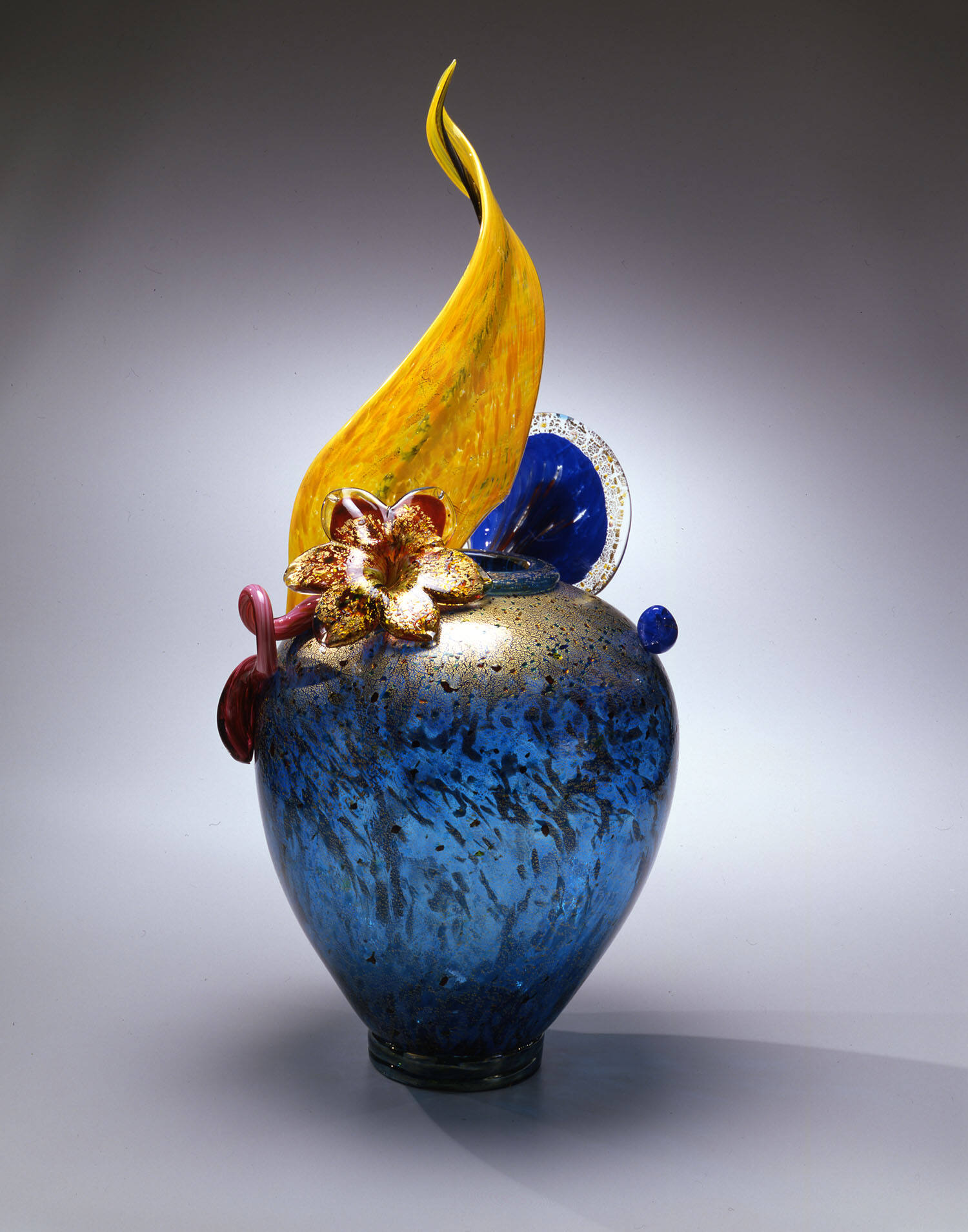 MediumColorless and colored glass; blown, applied and tooled decoration, gold leaf