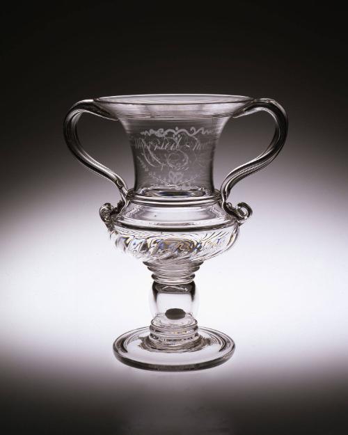 Label TextThis loving cup or urn was made at the New England Glass Company for glassblower George Dale and presented to him on the occasion of his marriage to Elizabeth Harrington on November 1, 1833. Inserted in the hollow knop of the stem are two English silver coins dated 1817 and 1818.Published ReferencesWatkins, Lura Woodside, Cambridge Glass, 1818-1888: The Story of the New England Glass Company, Boston, Marshall Jones, 1930; reprint, New York, Bramball House, 1953, pp. 73, 110, 167, ill. frontispiece.