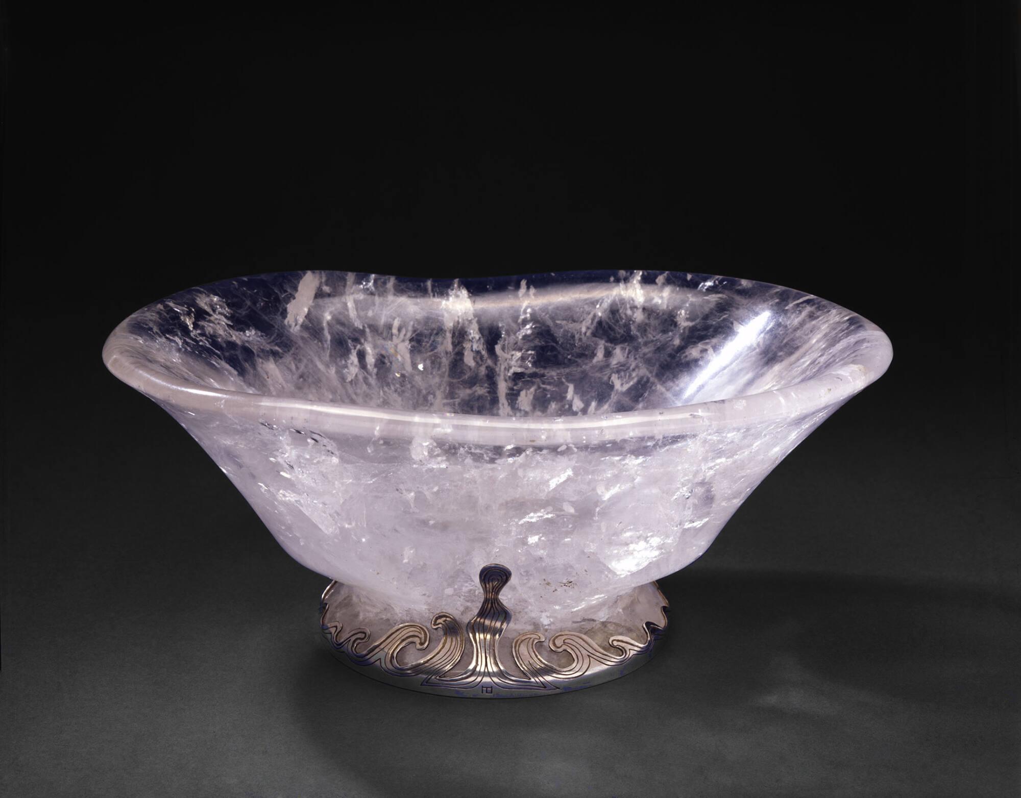 MediumRock crystal bowl, carved. cut, and polished; chased silver mount