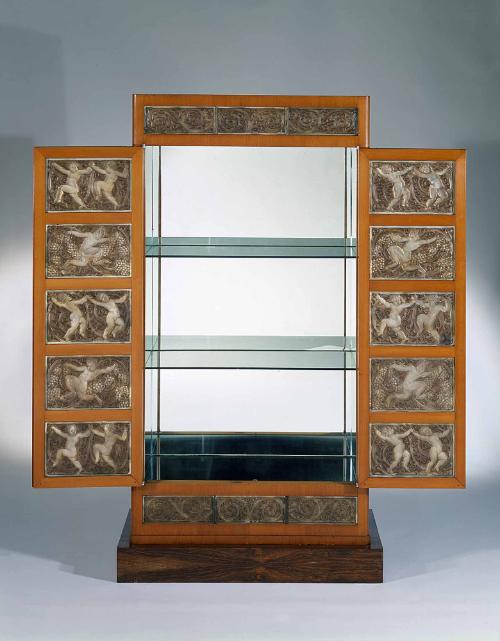 MediumPearwood cabinet and rosewood base on basswood (Tilia) carcass; silvered metal (brass?) fittings; press-molded colorless glass insets