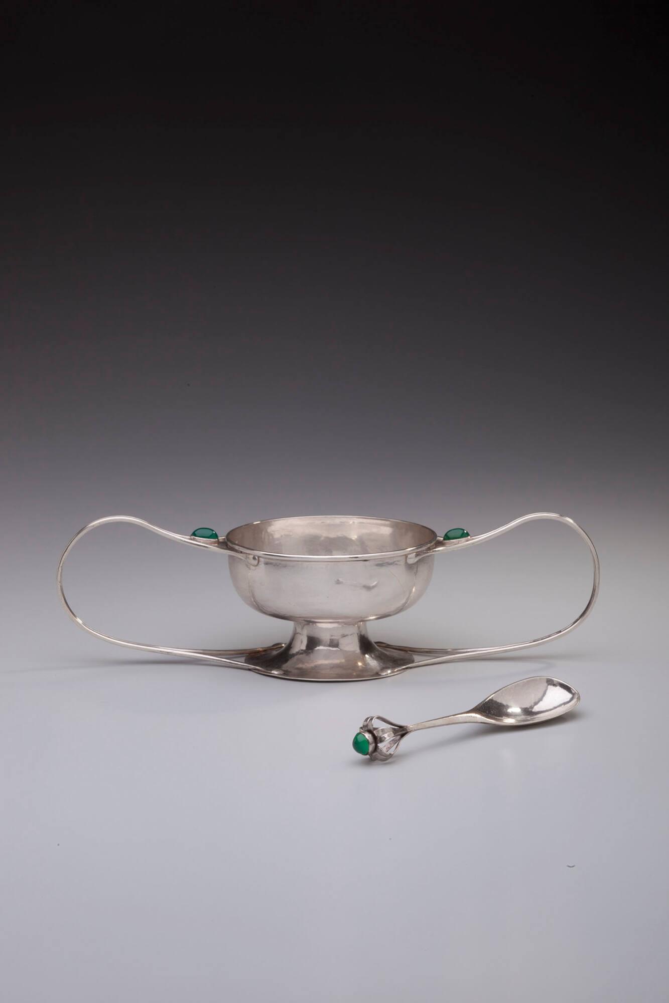 DimensionsSpoon: L: 5 1/2 in. (14 cm); Bowl: H: 2 9/16 in. (6.5 cm); Diam: 4 1/4 in. (10.8 cm); W (across handles): 10 3/4 in. (27.2 cm)