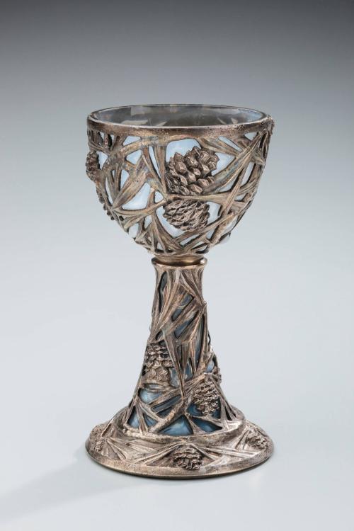Label TextTrained in Paris and London within the rigid practices of the 19th-century goldsmith’s trade, artist-jeweler René Lalique emerged as a leading Parisian jeweler of the Belle Époque. Lalique’s innovative designs were in stark contrast to traditional conventions and attracted an elite clientele with modern, esoteric tastes. His designs in the Art Nouveau style are radical departures in concept, trading a traditional emphasis on precious materials for a unified design concept. Inspired by Japanese art, Lalique distilled the aesthetic essence of nature, from insects to the humblest plants, with keen observation. It is Lalique’s work in jewelry and his experimentation with cast glass that eventually led late in his life to his successful career as an artist and designer of architectural installations and glass objects. Demonstrating his transition from jewelry to his cast glass vessels, this chalice features opalescent glass blown into a silver armature with pinecone and pine branch decoration.Published ReferencesToledo Museum of Art, Toledo Museum of Art Masterworks, Toledo, 2009, p. 286, repr. (col.).Exhibition HistoryParis: City of Art, November 6, 2009 - March 14, 2010.René Jules Lalique