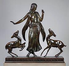Label TextWith its streamlined forms, fluid and graceful motion, and appreciation of classical subjects, Paul Manship’s sculpture was an important precursor to the Art Deco style. Manship deftly straddled the traditional taste for decorative beauty and the Modernist appreciation for simplified, abstracted form. In his works of great charm he was able to fuse elements from a wide range of cultures and eras, introducing a revitalizing freshness to American sculpture. This talent is displayed superbly in Dancers with Gazelles, one of his most famous compositions. The rhythmic grace of the group, the decorative detail along the sides of the base and the costume’s hem, and the curvilinear contours recall painting and sculpture from India. Indeed, Manship’s motif of a woman flanked by two gazelles may derive from a similar theme of dancing figures with animals found in Indian miniature painting.Published ReferencesInternational Studio, July 1923, p. 353, repr.