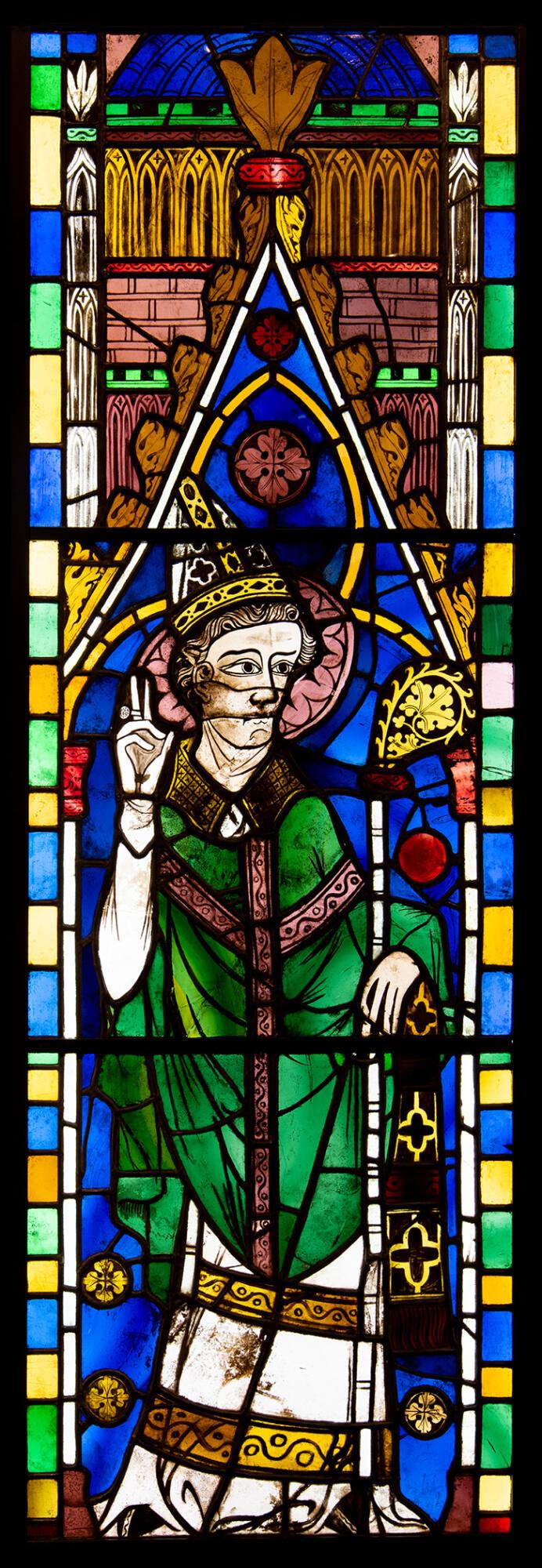 Label TextOriginally from the Cathedral of St. Etienne in Sens, France, these two windows in the tall, narrow format called a lancet each represent a figure standing under an architectural canopy, a common composition in stained glass from the turn of the 14th century. The bishop saint (on the left) raises his left hand in a gesture of blessing—a large ring on his middle finger—and carries a crozier (staff) in his right hand. The deacon saint (on the right) holds a book and a palm leaf. Almost seven feet tall, the windows are characteristic of a type frequently found in the side chapels of a medieval church, almost always installed in the clerestory, the upper part of a church below the roof. Made to be read from a distance, these figures have exaggerated, enlarged features, like the eyes, hands, and faces. The term “stained glass” is used as a general name for colored pieces of glass set into strips of lead (called cames) and fitted into iron frames as windows. However, the process of staining glass with silver oxide (where “stained glass” gets its name) was not widely used in Europe until the 14th century, although it is commonly found in glassmaking in the Islamic world from centuries earlier.Published ReferencesRaguin, Virginia Chieffo and Helen Jackson Zakin, Stained Glass before 1700 in the Collection of the Midwest States, London, Harvey Miller, 2001, vol. 1, p. 26, 33-4, 59-60, p. 4 (col.); vol. 2, TMA 6, p. 229, 236-7, 239-40, repr. p. 239.
