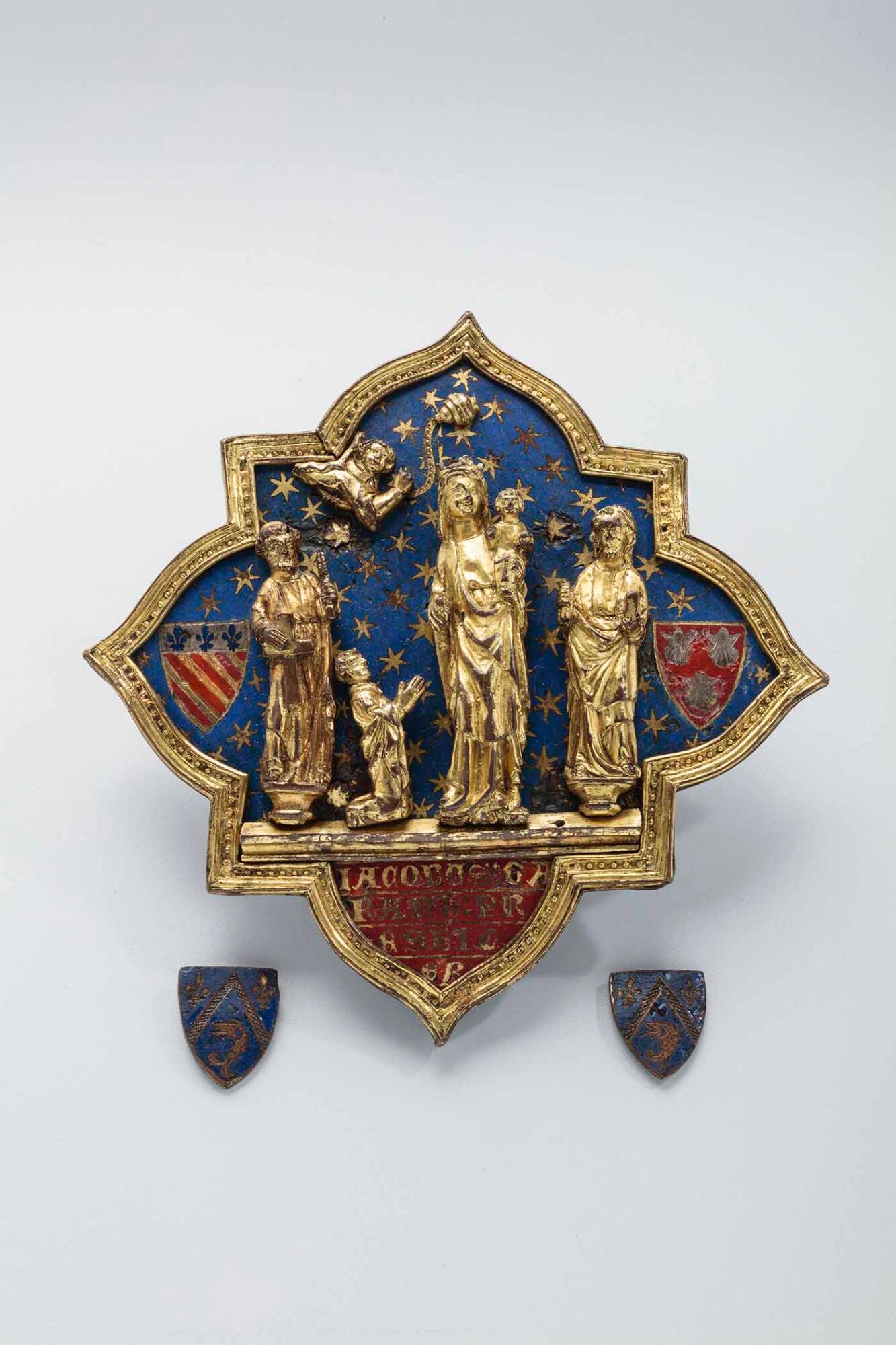 Label TextA clasp worn at the neck to fasten a priestly garment, this morse displays the Virgin Mary holding the infant Jesus, flanked by St. Peter and St. Paul. The praying figure in robes kneeling at Mary’s feet probably represents the clergyman who had the morse made, identified below as Iacobus Garand Presbiter. The heraldic shields, including the two separate escutcheons, possibly relate to his noble ancestry and that of a later owner.Published References