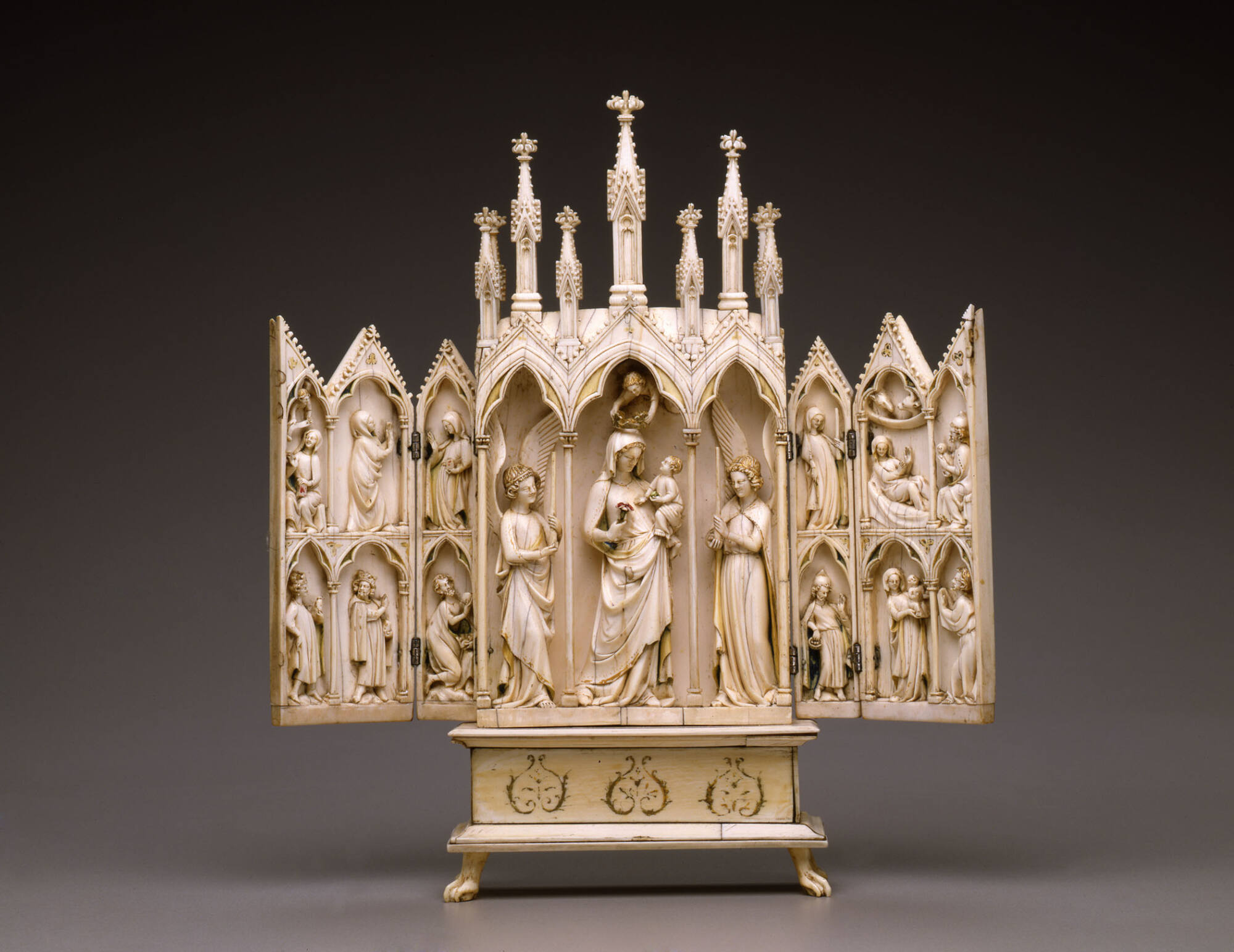 Label TextBeginning in the 12th and 13th centuries, the Virgin Mary played an increasingly central role in medieval devotion, and her cult developed rapidly in Western Europe. Worshiped as the Queen of Heaven, Mother and Bride of Christ, and personification of the Church, Mary was an important and powerful intercessor for the devout. Artists increasingly emphasized her humanity and maternal role. By the late 13th century, miniature tabernacles with statuettes of the Virgin and Child were favored products of French ivory carvers. Like the one on display, these portable objects could be folded up and taken with their owners as a travelling altarpiece. The central statuette of this tabernacle presents a standing Virgin and Child flanked by angels holding candles. A third angel crowns Mary from above as the Queen of Heaven. She supports the Christ Child who holds in his left hand an apple, signifying his role as the redeemer of humanity, or new Adam.Published ReferencesDarcel, Alfred, "La ivoires", La Collection Spitzer, Paris, 1890, I, p. 24, no. 84, pl. XXII.