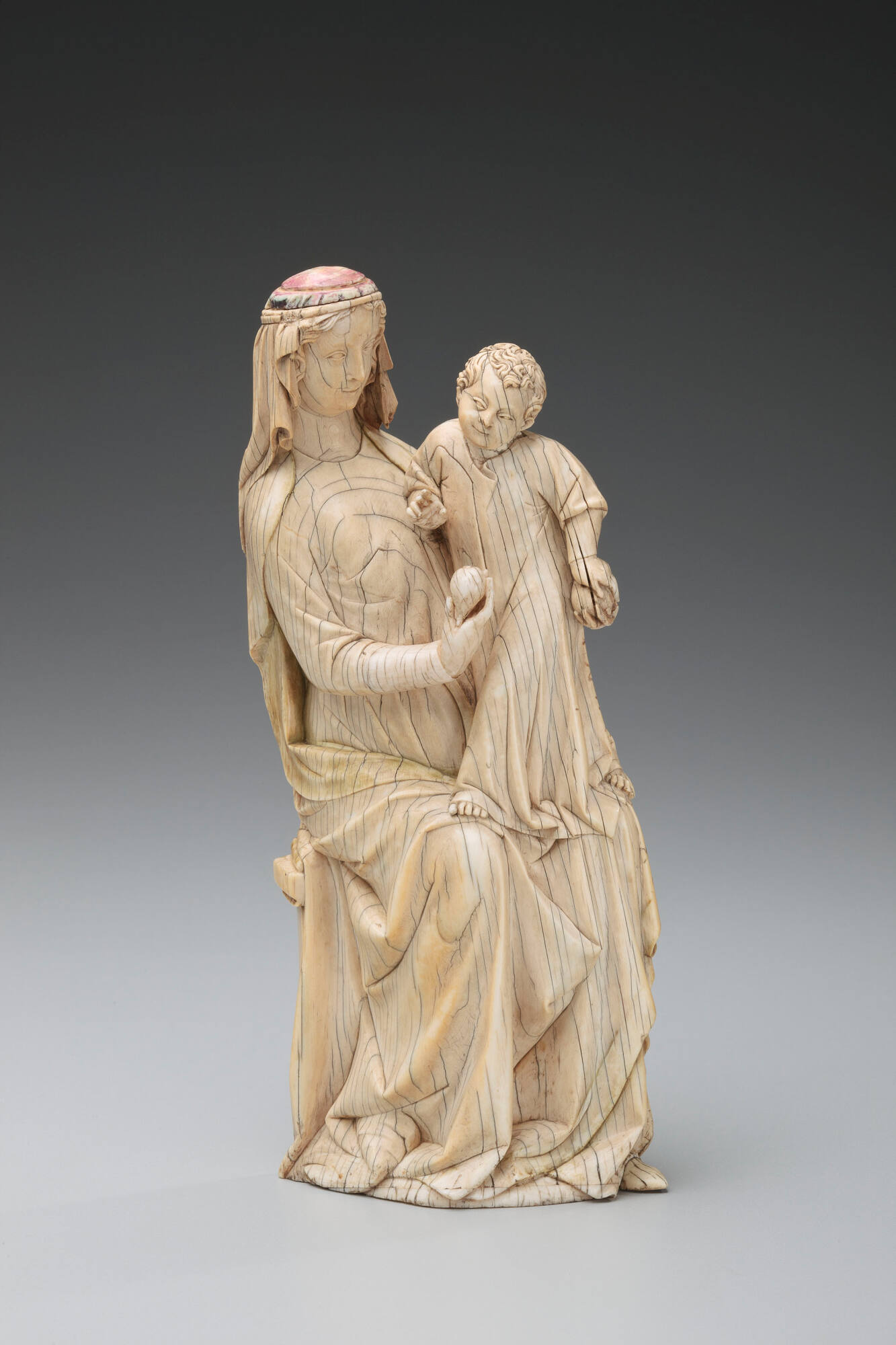 Label TextIn this playful and human representation of a mother supporting her child, Jesus takes his first step on Mary’s lap. Statuettes of the Virgin Mary and Christ Child were among the most popular choices for ivory production, as the material itself reaffirmed deep-rooted ideas about gender. Cool to the touch at first, ivory slowly warms with tactile engagement. Since antiquity, many writers associated women with coldness and men with heat. For medieval Christians, the feel and color of the ivory may also have conjured notions of chastity and purity appropriate for depicting Mary and other virgin saints.Published ReferencesE. Molinier, Catalogue of the Frederic Spitzer Collection, vol. 1,Paris, 1890, no. 44, repr. pl. 17.