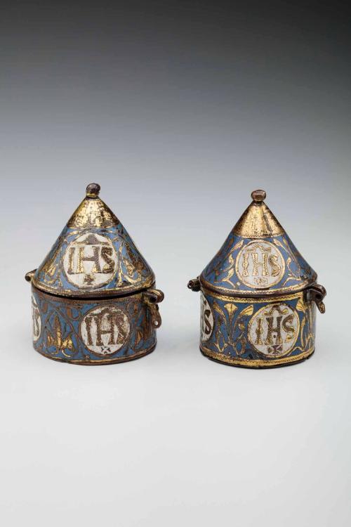 DescriptionCircular with dome lid; gold floral motif and medallions containing the monogram IHS.