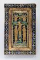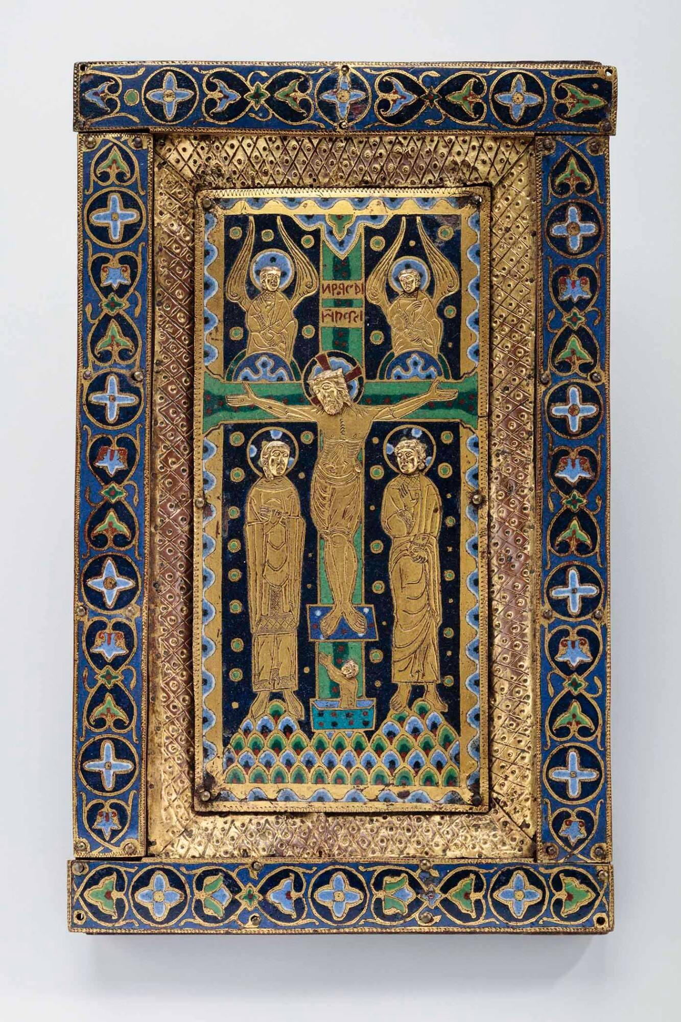 Label TextThis panel once served as the front cover of a manuscript, probably a book containing the Gospels of Saints Matthew, Mark, Luke, and John. It comes from Limoges, France, a town renowned for its enamel industry. Splendidly decorated enameled copper plaques are affixed to a wooden panel, a durable and relatively affordable alternative to opulent silver or gold. The center plaque depicts Christ on the cross, flanked on his left by his apostle, John the Evangelist, and on his right by his mother, the Virgin Mary. Angels hover above. Adam, the first man, rises from his grave at the foot of the cross, making clear an essential Christian belief: Christ’s death redeemed Adam’s sin of eating the fruit of knowledge, providing salvation to all mankind. The image would be visible when clergymen carried the book in processions, held it aloft during church services, or displayed it on an altar.Published ReferencesChristie, Mary Joanne, The Picture Story of Art, Toledo, Ohio, Gregorian Press, 1963, p. 113, repr. 112, no. 147.