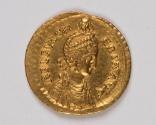 Label TextThis gold coin depicts Aelia Pulcheria, one of the most powerful women in the late Roman world. The sister of Emperor Theodosius II, she held the rank of Augusta (Empress) and effectively ruled the Eastern Empire for decades. The portrait emphasizes her divine right to rule, showing the Hand of God reaching down to crown her. On the reverse, the ancient pagan figure of Victory is reimagined for a Christian empire: she inscribes a shield not with scenes of battle, but with the Chi-Rho, the monogram of Jesus Christ. This fusion of Roman military imagery and Christian symbolism announced the "Salvation of the Republic" (Salus Reipublicae) under the protection of the Church.388-393 CE