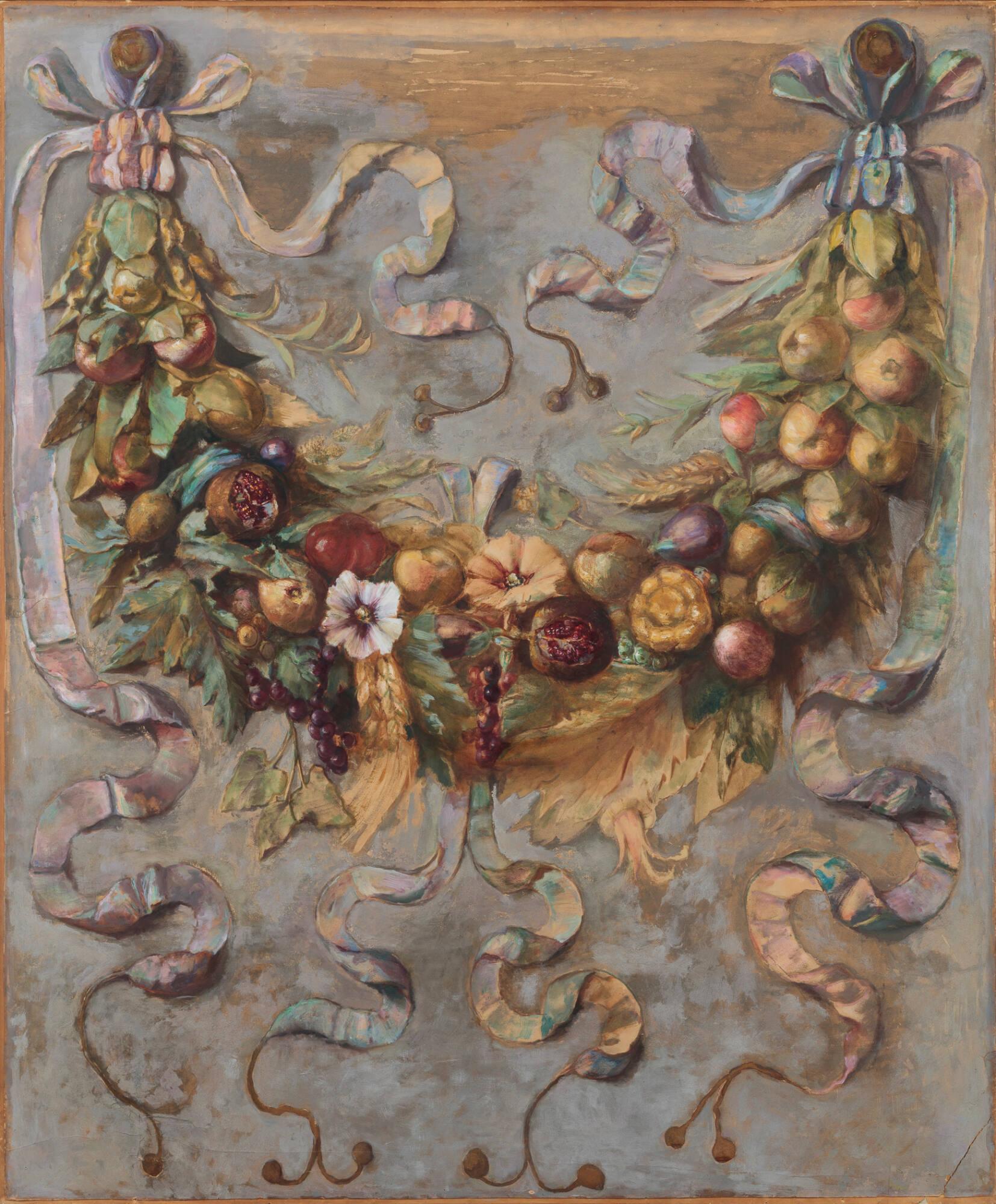 Exhibition HistoryNew York, Ortgies and Co., Important Collection of Oil and Water Color Paintings by John La Farge, 1884, no. 91 ("cartoon for embroidery for dining room of Cornelius Vanderbilt, Esq. Hanging garland of fruit and flowers. In oil, on paper, silver ground").New York, Reichard and Co., Catalogue of Drawings, Watercolors and Paintings by Mr. John La Farge, N.A., 1890, no. 25 ("working design for embroidery. Hanging garland of fruit and flowers. Motif from Sansovino. Water, wax and oil").