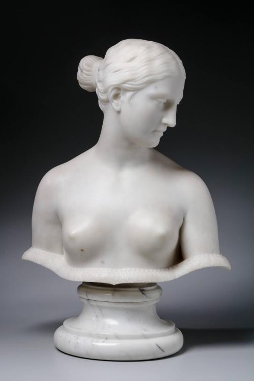 Label TextThe full-size version of Hiram Powers’ Greek Slave was once the most famous American sculpture. It toured the country in 1847–48, during which it was seen by more than 100,000 paying people. Depicting a Greek maiden, nude, her hands chained, it became a symbol of moral (Christian) purity in the face of “barbarity” (represented by the Turkish Ottoman Empire). The image played on largely imagined (white) cultural fears, but despite the era in which it was produced, there was little commentary at the time linking it to the very real practice of chattel slavery of Black people in the United States. The Greek Slave proved so popular that sculptor Hiram Powers, who worked in Italy, could hardly keep up with the demand for copies. Smaller tabletop versions were produced, as well as bust-length versions like the one in Toledo’s collection.Published References
