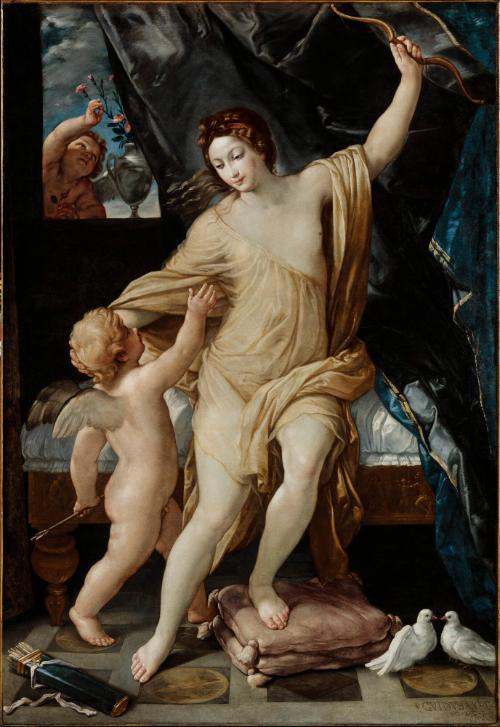 Label TextVenus, goddess of love and beauty, and her son, Cupid, mischievous child-god of love, were a favorite subject for artists of the Renaissance and later centuries. Here Venus gently and teasingly takes Cupid’s bow away, preventing him from inflicting the wounds of love (for a similar theme on the “disarming” effects of love, see Poussin’s Mars and Venus nearby). The pair is surrounded by symbols of love: roses, doves, and a carved band on the bed showing the lovers Mars and Venus with Cupid. To contrast with the dynamism of the strong diagonals, Guido Reni emphasized the contours of the graceful, elongated figures, whose cool, delicately modulated tones recall the appearance of marble sculpture. This painting was apparently executed for a goldsmith, who intended to sell it for a profit. As payment, he gave Guido Reni a diamond; the painting was subsequently known as Il Diamante. Reni, known in his day as the “Divine Guido”, was revered for his classically inspired, gracefully proportioned figures, balanced and harmonious compositions, and delicate color.Published ReferencesLuzio, A., La galleria dei Gonzaga venduta all'Inghilterra, 1627-1628, Milan, 1913, p. 317.