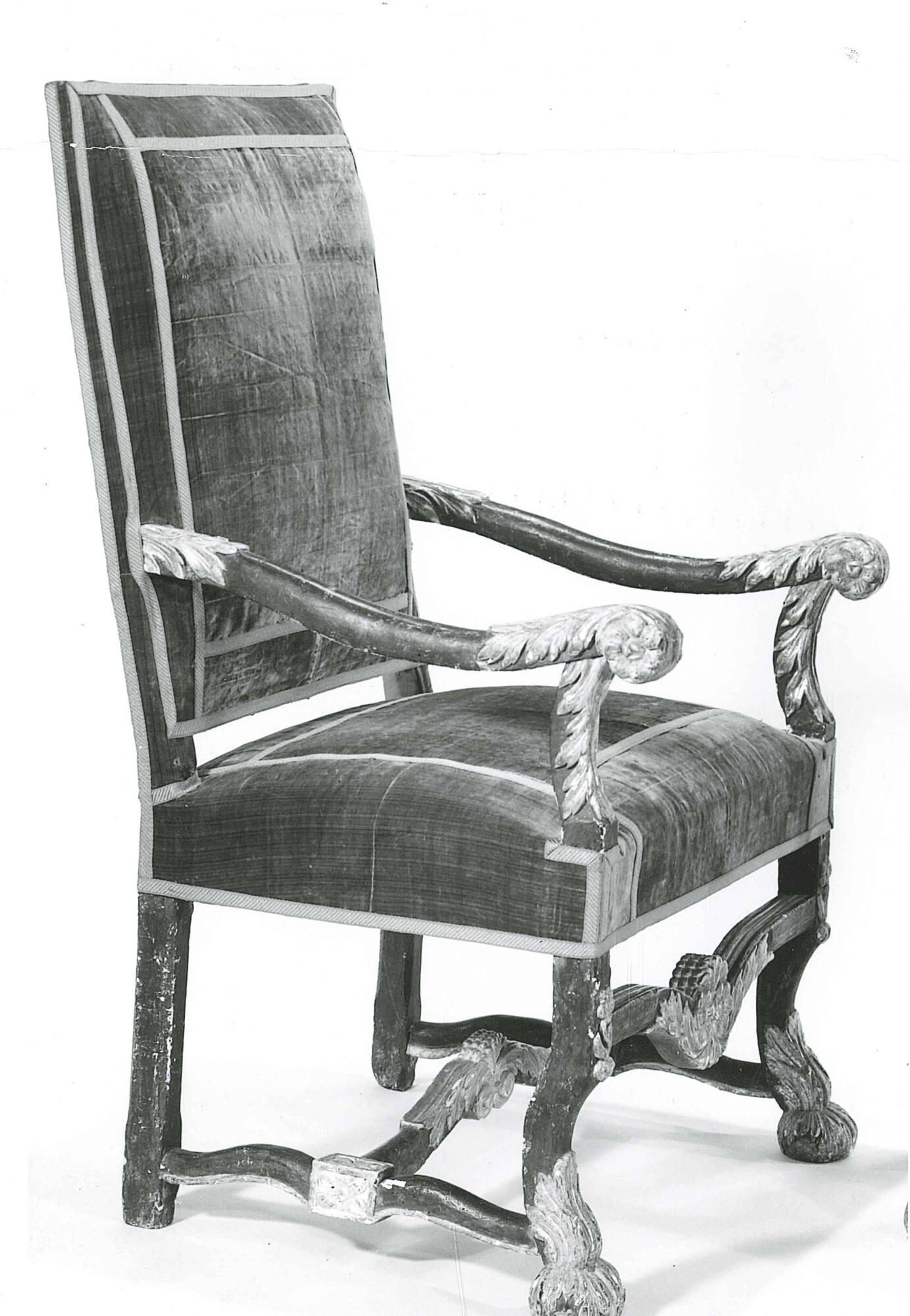 MediumWood, carved, painted, and gilded over gesso base, with modern red velvet upholstered band and seat
