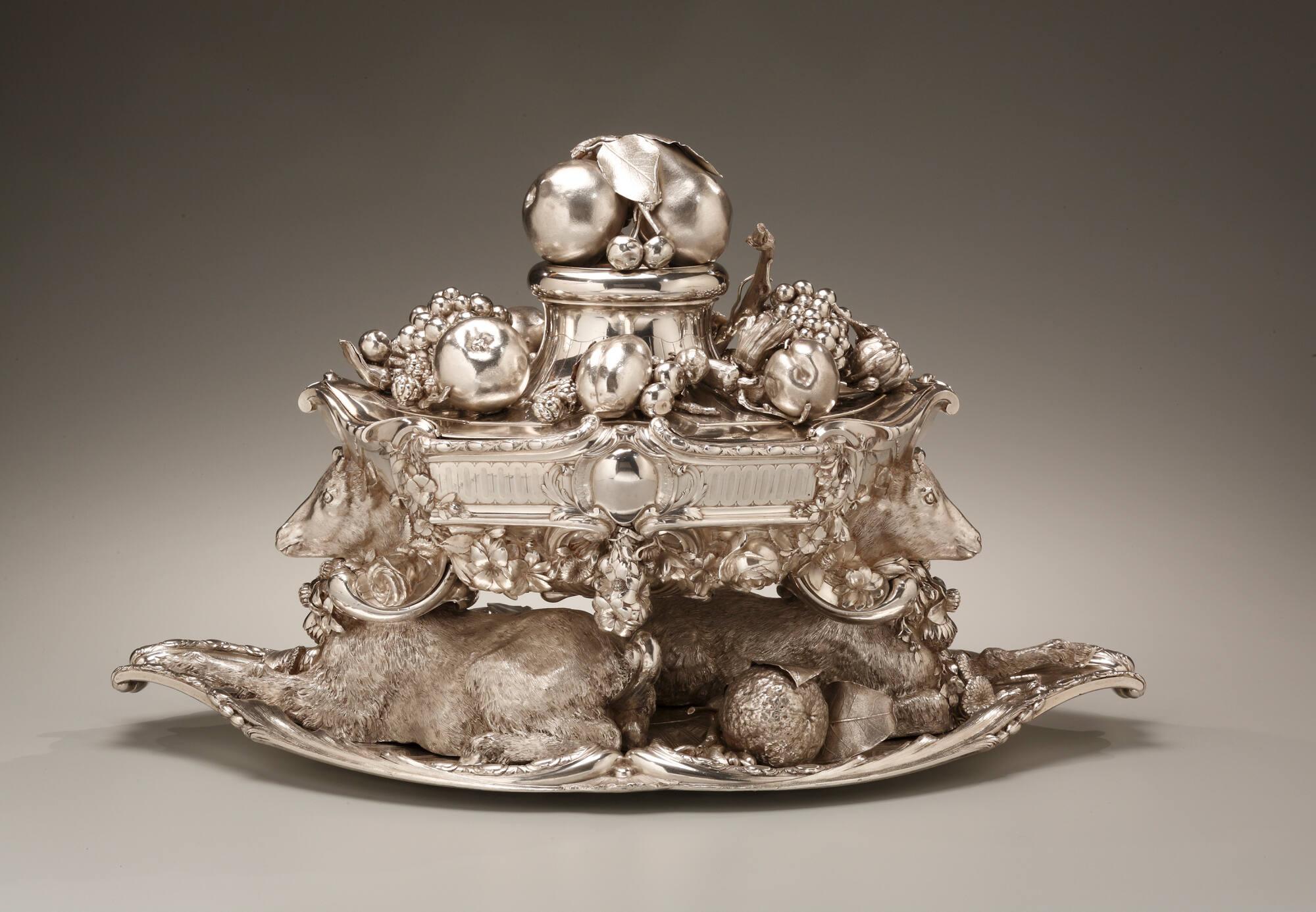 Label TextThis magnificent soup tureen’s function is almost entirely hidden by its elaborate sculptural ornament. The tureen itself—encrusted with fruits and flowers and cushioned by garlands of delicately rendered flowers—rests on the backs of two reclining goats. The goats’ heads are part of the tureen, but when the vessel is placed on its stand, as displayed here, the neck of each goat rests on an upturned scroll. The asymmetrical but well-balanced design keeps the eye moving restlessly from one nature-inspired detail to the next—the fur of the goats, the dimpled skin of the lemons, and the intricate flowers and leaves. One of the finest examples of English Rococo silver, the tureen may have been owned by Charles Seymour, Duke of Somerset (1662–1748), whose family crest is engraved on the tureen’s liner.Published ReferencesCripps, Wilfred, Old English Plate, 11th ed., London, 1926, p. 333.