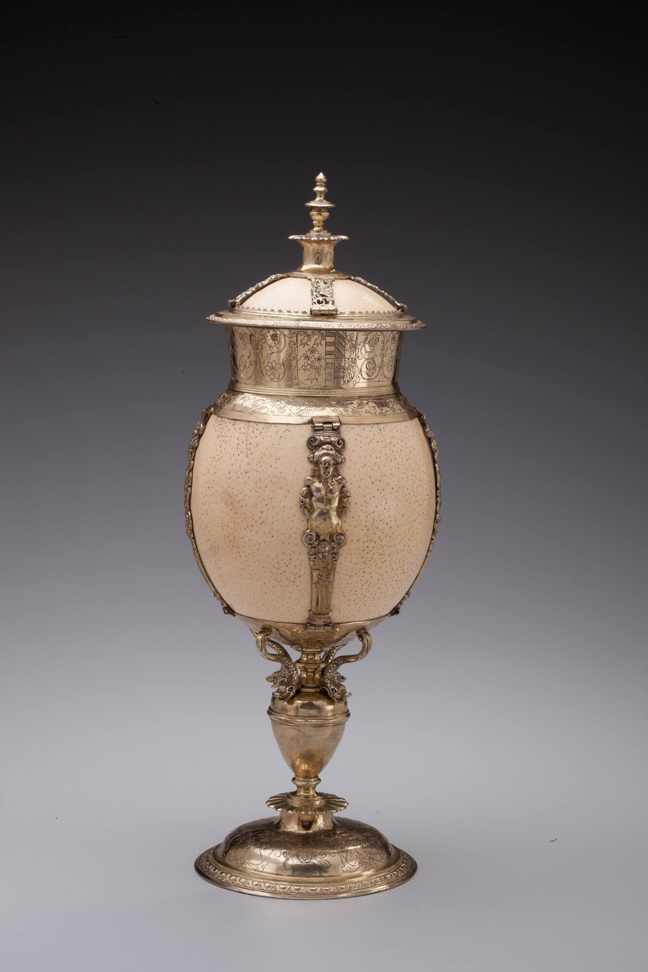 Label TextIn Europe beginning in the 1500s, princes, aristocrats, and wealthy merchants assembled collections representing a “theater of the universe:” the wonders of nature (naturalia) and the wonders of human creativity (artificialia). Such collections, called a “cabinet of curiosities” or kunstkamer (“art room”), often included European paintings and art objects; insects and shells; and art and artifacts from Asia, Africa, and the Americas. The size alone of an ostrich egg marked it for admiration, as did its faraway origin (across the southern Sahara in Africa). But when transformed by the skill of the goldsmith into a fanciful goblet, such a curiosity became doubly prized, combining the best aspects of both nature and humankind to represent “God’s natural order.”Published ReferencesW. J. Cripps, Old English Plate, London, 1926, p. 342.