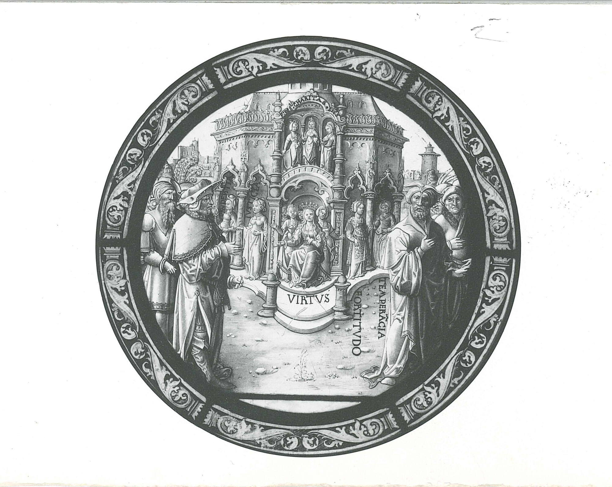Label TextUsed in guild halls, town halls, courts, chapels, and private homes in Northern Europe during the 16th century, stained glass roundels often had moralizing messages. This example imagines a grand Temple of Virtue in an urban setting, with the personification of Virtue seated on a throne, surrounded by other female figures. She is flanked by the four classical cardinal virtues: Prudence, Justice, Fortitude, and Temperance. Surmounting them all are the three Christian theological virtues: Faith, Charity, and Hope.Published ReferencesV. Falke, O., Die Kunstsammlung von Pannwitz, II, no. 112.14th Century