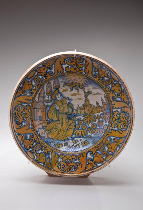 DescriptionYellow luster and blue. St. Francis receiving the Stigmata.