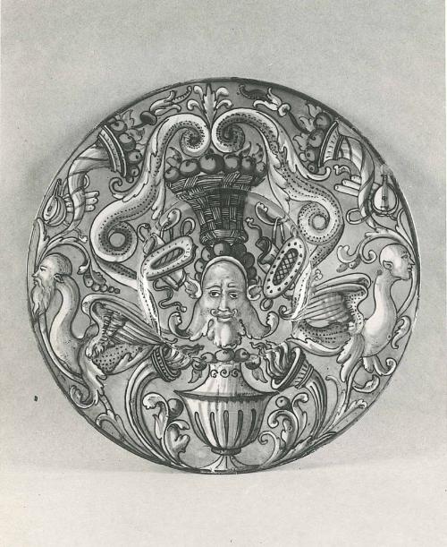 DescriptionDecorated in blue and ruby luster on golden field. Mask in center, two winged human-headed monsters at sides