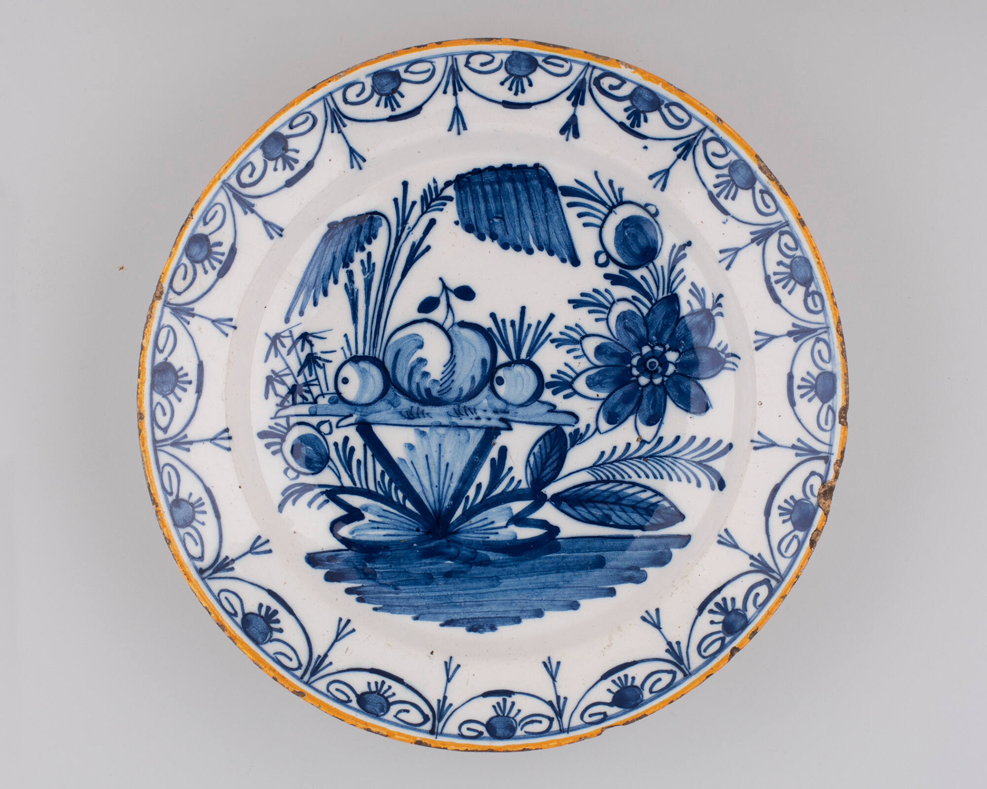 DescriptionTin-glazed earthenware, known as delftware. Blue painted decoration, yellow rim.