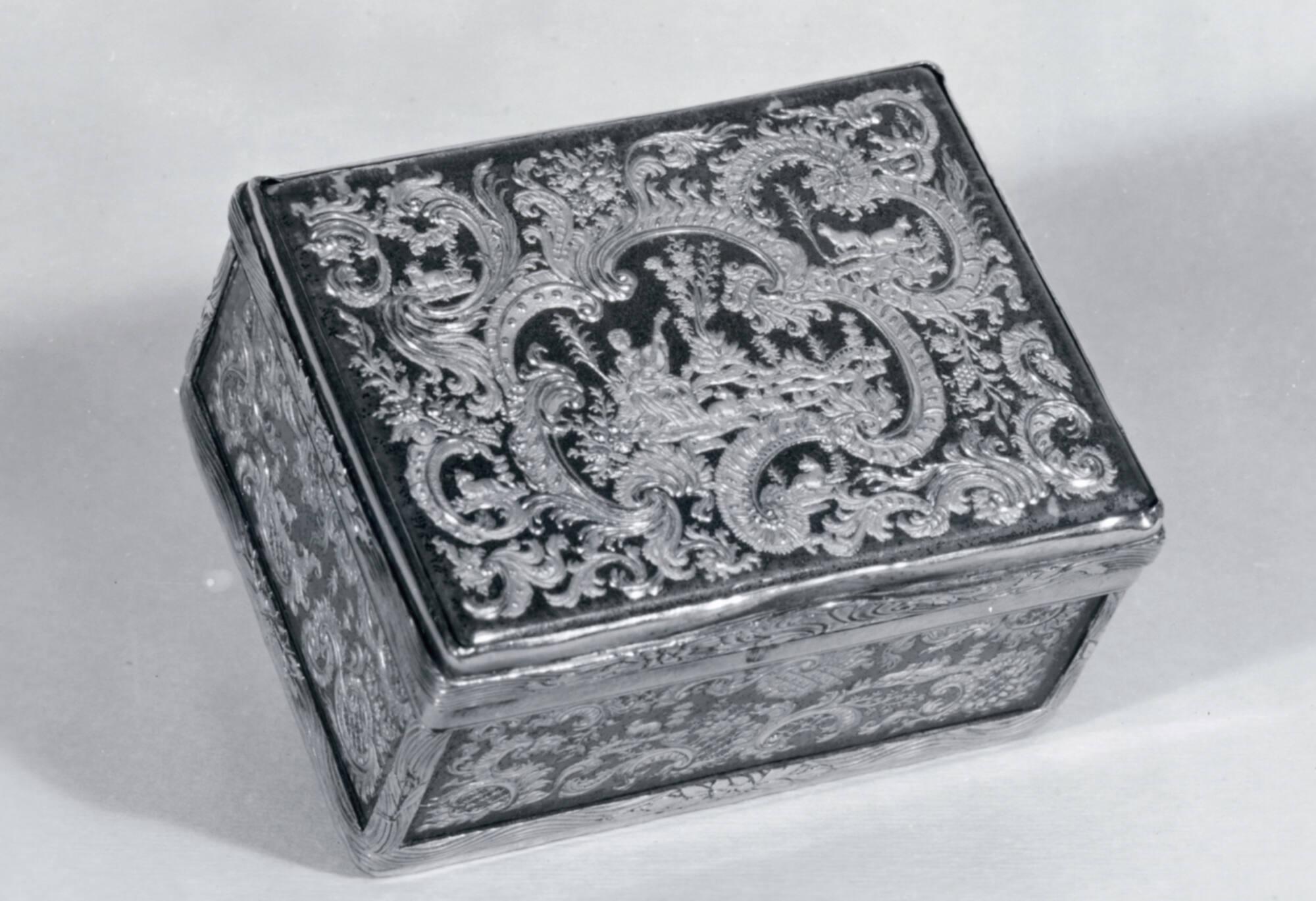 DescriptionEngraved with rococo scrolls and foliage and pastoral motifs.