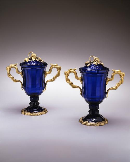Label TextThis pair of mounted cups represents the collaboration of two very successful English craftsmen: Thomas Heming (1722/3–1801), the Principal Goldsmith to King George III, and the high-end glasscutter Thomas Betts (died 1765). The design depends on the striking appearance of the richly textured, gilded silver mounts against the faceted and polished surface of the deep cobalt blue glass. The pleasing combination appears to have little precedent in England. The elegant swirled flutes decorating the lids required unprecedented control of the cutting wheel. Glass-cutting at the time was dirty and dangerous, since the fine particles thrown off by the process were rich in poisonous lead.Published ReferencesH. H. Mulliner, The Decorative Arts in England 1660–1780.Batsford, 192), fig. 172.