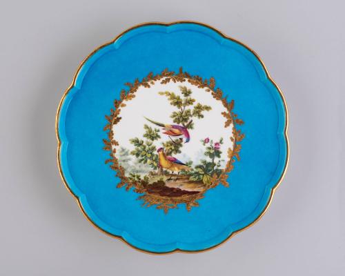 Label TextIn the 18th century, the celebrated Sèvres porcelain manufacturer produced elaborate table services with sometimes hundreds of pieces. The striking bleu celeste (“heavenly blue”) pieces displayed here are part of a service meant for the serving of both dinner and desserts. Cheese, meat, soup, cakes, custards, ice creams—each was served in a cup, plate, or bowl designed specifically for that purpose. The 368-piece service (now dispersed among many collections) was commissioned by Cardinal Prince Louis de Rohan to commemorate becoming French ambassador to the court in Vienna. The plates feature Rohan’s monogram “LPR.” The splendidly painted (if fancifully colored) exotic birds on the pieces were probably based on the prints in George Edward’s 1743 publication A Natural History of Birds.Exhibition HistoryToledo Museum of Art, Hitchcock Gallery, Vive Le France: Sevres Porcelain in the 1800s, March 4 - June 12, 2005.about 1790