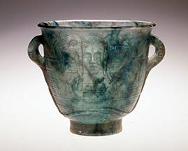 DescriptionMottled green glass. Relief decoration of Medusa-like masks with snakes joining handles on each side.